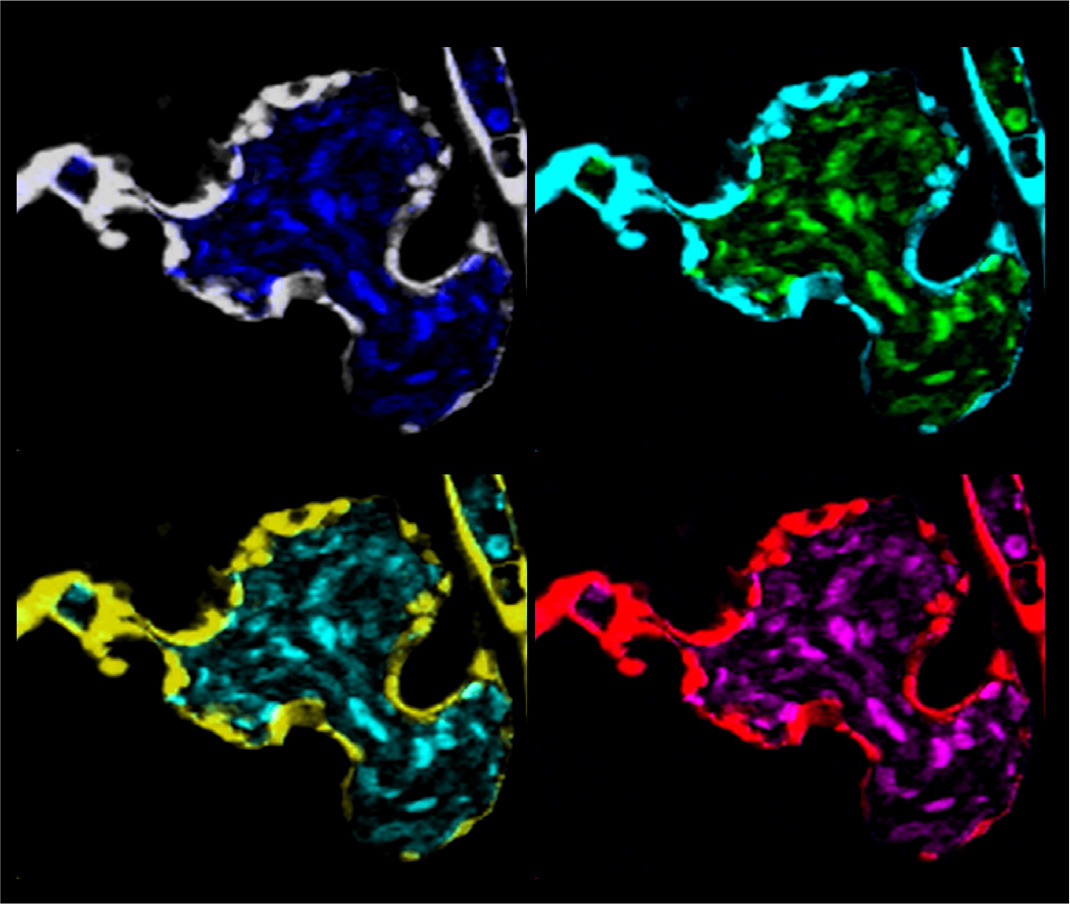 Confocal image of an embryonic heart from prkd2 (protein kinase D2) mutant zebrafish depicting the cardiac endothelium with Tg(kdrl::eGFP) and circulating blood cells with Tg(gata1::DsRed). Panels are pseudocolored, inspired by Andy Warhol’s art movement. prkd2 embryos exhibit the extreme phenotype of outflow stenosis (arrow) and total retrograde blood flow from the ventricle to the atrium and no blood circulation by 72 hours post fertilization (hpf). They survive however, with a beating heart, for up to 120 hpf.