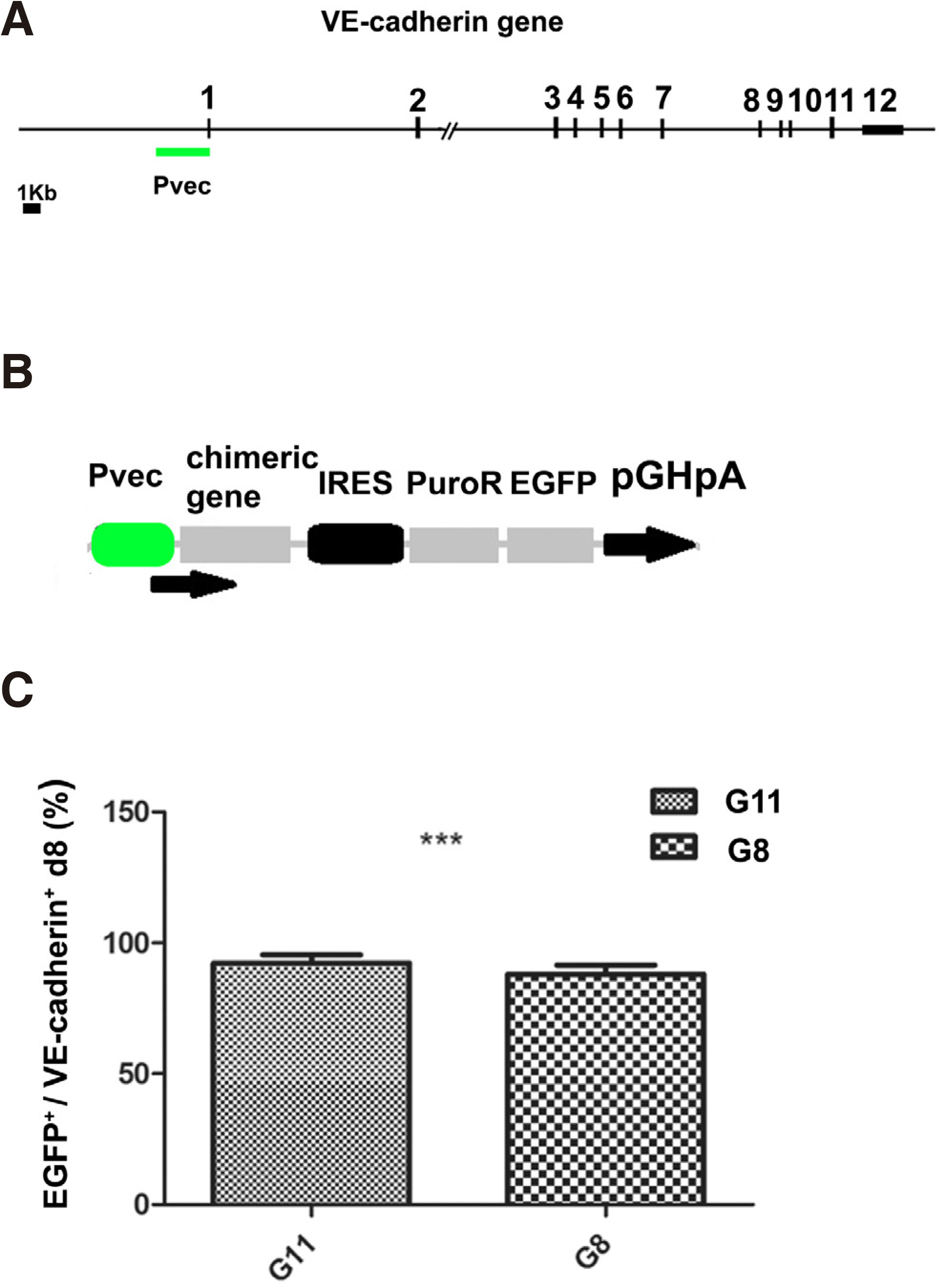 (A) Schematic representation of the location of the 12 exons and the VE-cadherin/Cdh5 mouse promoter. (B) Schematic representation of episomal construct pPvec-EGFP, used for generation of ES clones. (C) Statistical analysis of the percentage of VE-cadherin+ cells co-expressing EGFP at d8 from three independent experiments. ***P< 0.001. (from Maltabe et al., 2016).