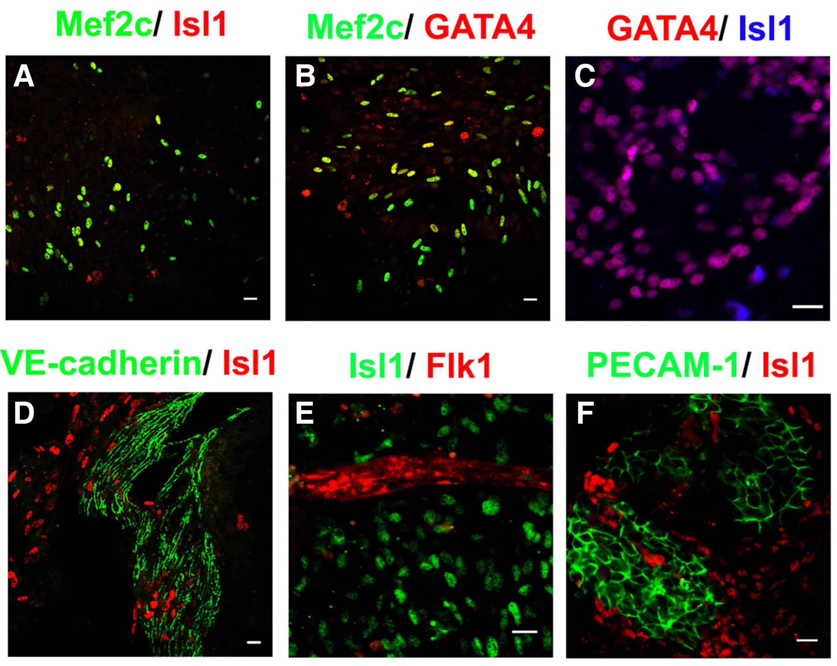 (A-F) Propagated cells consist of cell populations expressing markers of cardiac (Isl1, Mef2C, GATA4) and/or endothelial (Flk-1, PECAM-1, VE-cadherin) progenitors. Scale bar 20μm. (from Maltabe et al., 2016).