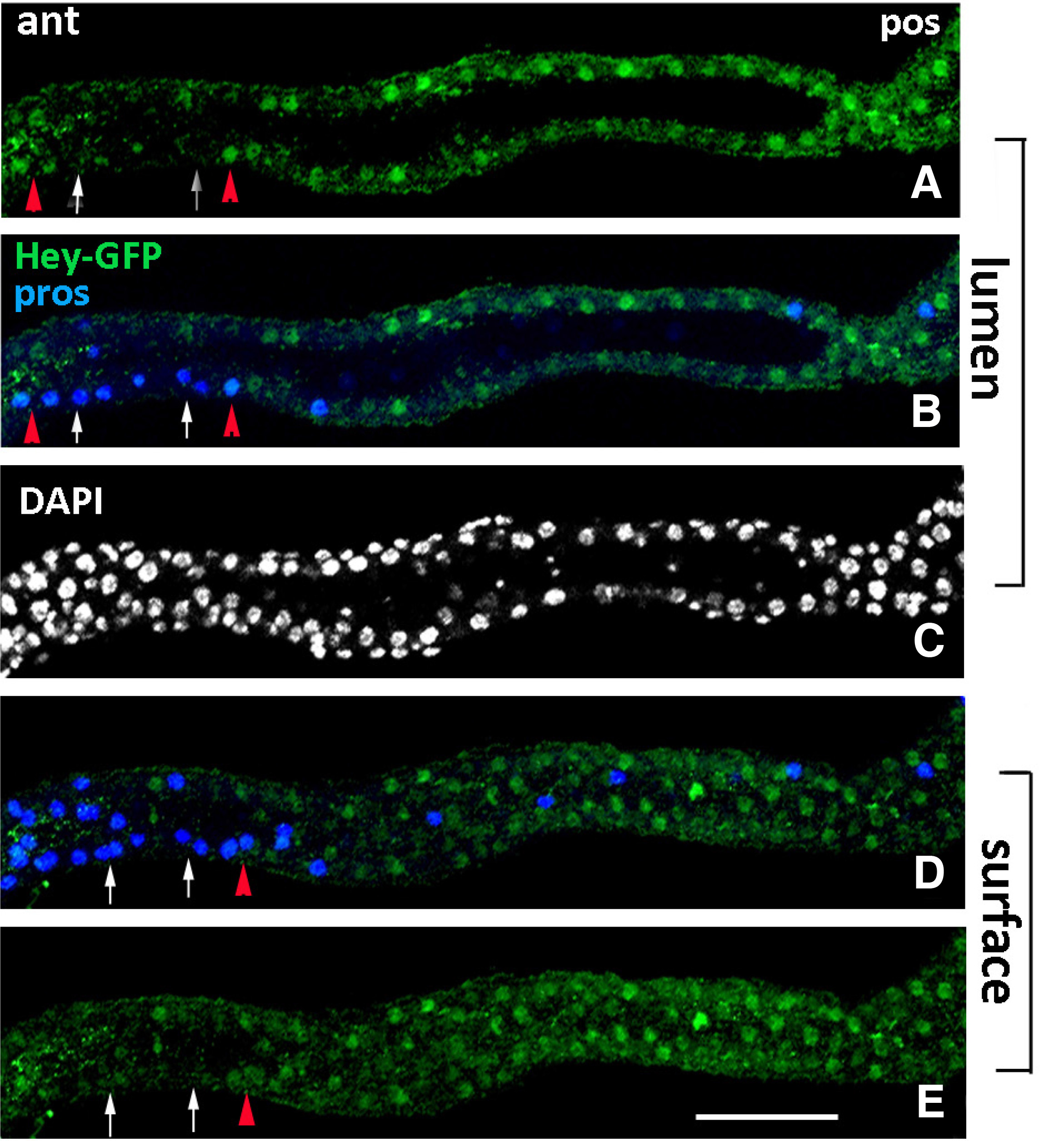 Early 1st instar larval gut of Hey-GFP line stained for GFP (green), indicating expression of the Hey-GFP fusion and for Prospero (blue). All images represent group of sections from the same anterior midgut region focused on different levels of the tissue, lumen (A-C) and surface (D-E). Hey-GFP expression (green) is detected in a subset of Pros+ (blue) cells in this early stage (examples shown by red triangles in A, B, D, E). White arrows in the same images point to Pros+ cells that are devoid of Hey-GFP expression. Many enterocytes are also stained for Hey-GFP (green) along the epithelium (A-E). Anterior is left. Scale bar, 25μm.