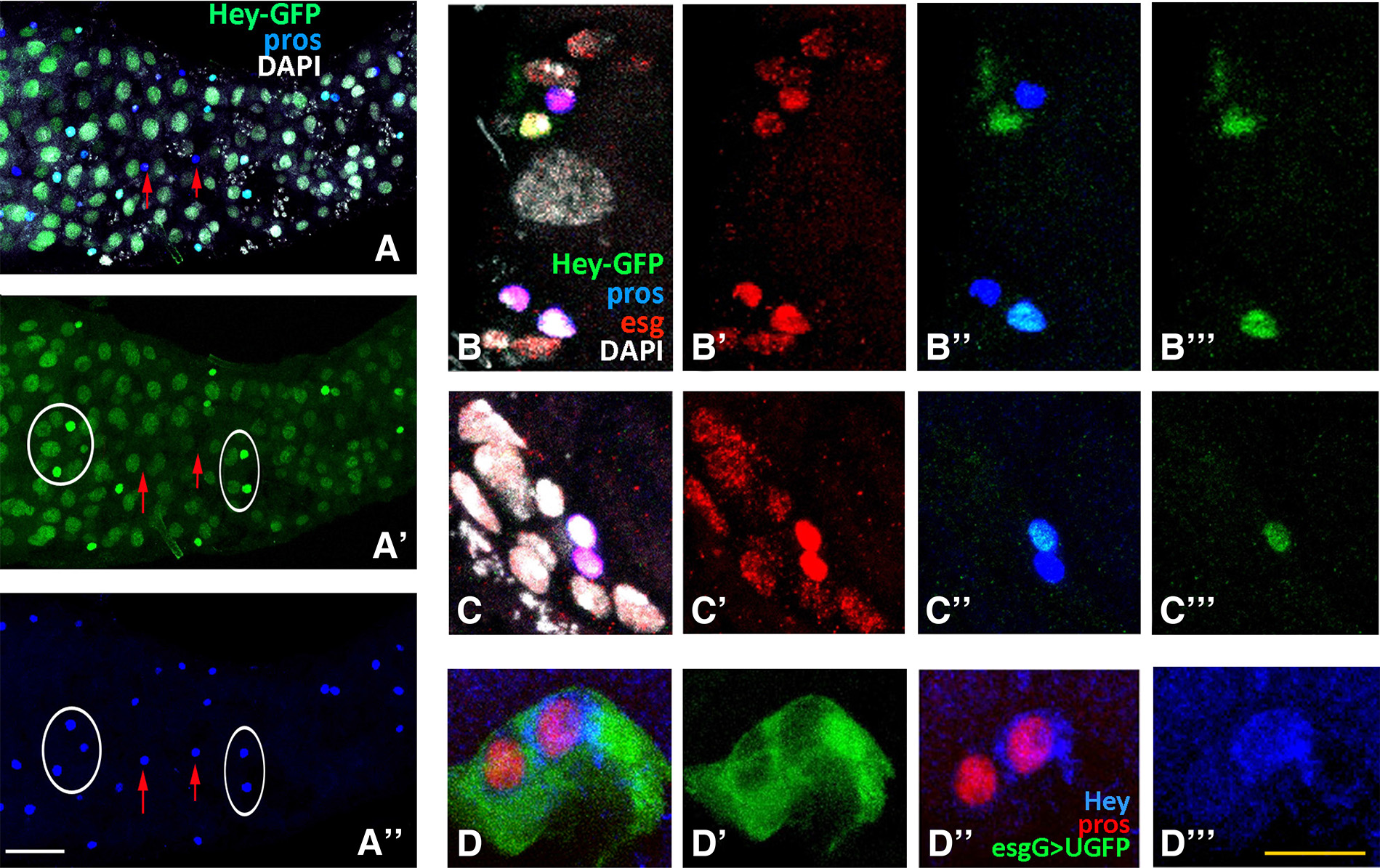 Third instar larval gut of Hey-GFP line (A-C), treated with methanol fixation and stained for GFP (green), indicating expression of the Hey-GFP fusion, for Prospero (blue) and Escargot (red). (A-A’’) Images of sections from the same anterior midgut surface region. Many enterocytes are stained for Hey-GFP (green) along the epithelium (A, A’). Hey-GFP expression (green) is also detected in a subset of Pros+ (blue) cells (examples shown by ovals in A’, A’’). Red arrows in the same images point to Pros+ cells that are devoid of Hey-GFP expression. Anterior is to the left. (B-C) Representative images of posterior midgut AMP islands showing the de novo Prospero expression (blue) in two AMP cells (B’’, C’’). One of the two Pros+ cells is also stained for Hey-GFP (green) (B’’’, C’’’). DAPI nuclear staining (white) and Escargot immunoreactivity (red) are detected in all AMP cells of the island. Note that the Pros+ Hey-GFP+ doublet is strongly stained by Escargot (B’, C’). (D-D’’’) Example of an AMP island at the posterior region of third instar lava midgut from the esgGAL4>UGFP line stained with antibodies against GFP (green), displaying the AMP island cells, Prospero (red) and Hey (blue). One cell of the Pros+ pair (red, D’’) within the island (D’) is Hey-positive as well (D’’’), suggesting adequate levels of Hey protein expressed to be detected by Hey immunostaining. Scale bars, 45μm (A-A”), 12μm (B-C”’), 10μm (D-D”’).