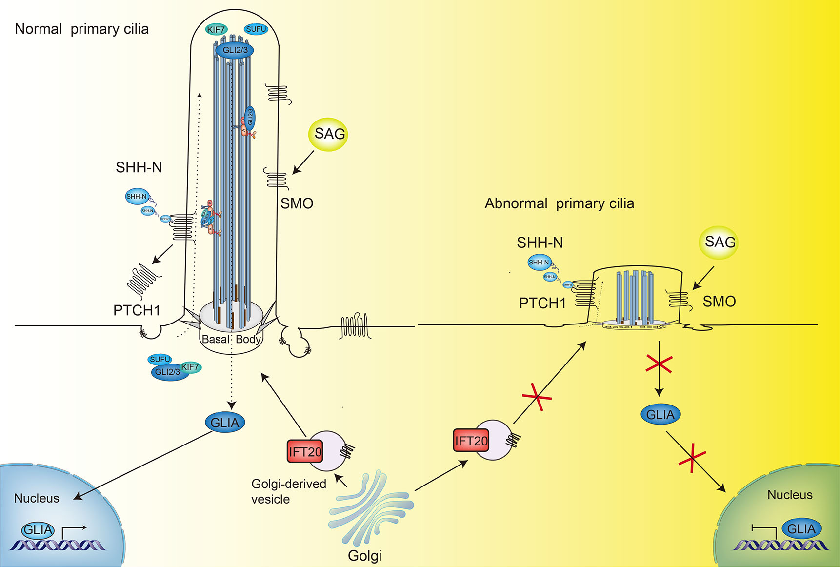 IFT20-assembled primary cilia mediate the HH signaling pathway. Upon binding of the SHH ligand to PTCH1, the inhibition of SMO by PTCH1 is relieved, leading to movement of PTCH1 out of the primary cilia and of SMO into the primary cilia. KIF7, SUFU, and GLI also accumulate in the primary cilia, and activated SMO promotes the dissociation of the SUFU-GLI2/3-KIF7 complex and generates activated GLI(GLI-A). The activated GLI-A moves into the nucleus and induces the transcription of downstream target genes; Mutation or disruption of IFT20 blocks trafficking from the Golgi apparatus to the cilia, resulting in shorter and fewer cilia. Accompanying the failure of SMO transport to cilia is inhibition of cilia-dependent SHH signaling.