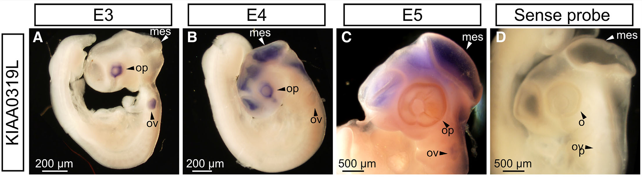 (A) KIAA0319L is expressed in the optic cups and otic vesicles at E3. (B) At E4, KIAA0319L displays strong staining in the diencephalon, mesencephalon, telencephalon, metencephalon and optic vesicle. (C) At E5, signal persisted in the telencephalon, mesencephalon and metencephalon. Expression in the optic vesicle is diminished. (D) Control sense probes gave no visible signal. mes, mesencephalon; ov, otic vesicle; op, optic vesicle.
