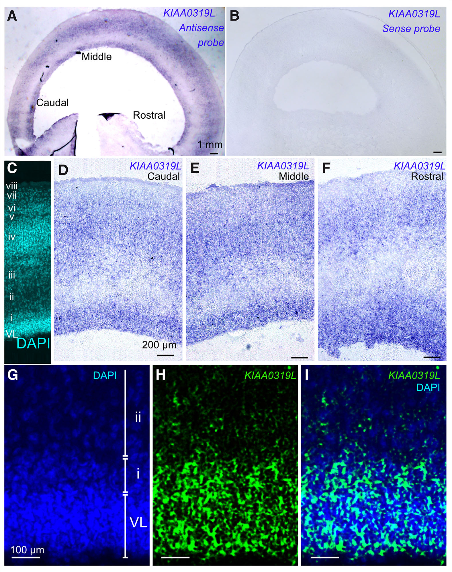(A) KIAA0319L expression in the E9 chick optic tectum along the rostral-caudal axis. Relatively strong signal is seen in the ventricular layer and in the middle layers as indicated by in situ hybridization. (B) Sense control does not display any signal. (C) DAPI staining (cyan) displays layer structure of the E9 optic tectum. The ventricular layer (VL) and layers i to viii can be observed. (D-F) KIAA0319L expression as seen under higher magnification in the caudal, middle and rostral position in the optic tectum. KIAA0319L expression is observed in the deeper layer, layer iii and layer iv. (G-I) High power magnification of the deeper layer. The bright field picture is inverted and is given a pseudo-color (green: KIAA0319L) and merged to DAPI (blue). KIAA0319L expression overlaps with the ventricular layer as well as with layer i (sub-ventricular layer).