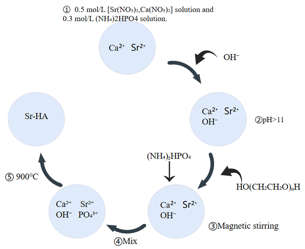 In this method, a 0.5 mol/L [Sr(NO3)2, Ca(NO3)2] solution and a 0.3 mol/L (NH4)2HPO4 solution are prepared. The pH values of these Ca and Sr solutions are adjusted to >11 using concentrated ammonia and to >10 using a phosphorus solution. Next, a certain amount from both solutions is mixed thoroughly, followed by the addition of 0.4 g of polyethylene glycol and magnetic stirring to dissolve polyethylene glycol. Under the stirring condition, the (NH4)2HPO4 solution is added slowly in a dropwise manner to maintain the n (Ca+Sr)/n (P) atom ratio at about 1.67, and again the mixture is stirred well. Then, it is transferred to a teflon-lined stainless steel hydrothermal kettle and heat-treated at 900°C. The product is then washed with water, followed by an ethanol wash, and filtered. Then the powdered product is dried at 80°C overnight (Fig. 3) (Li et al., 2022; Donazzon et al., 1998). The reaction mechanism of Sr-HA preparation by hydrothermal method is as follows: