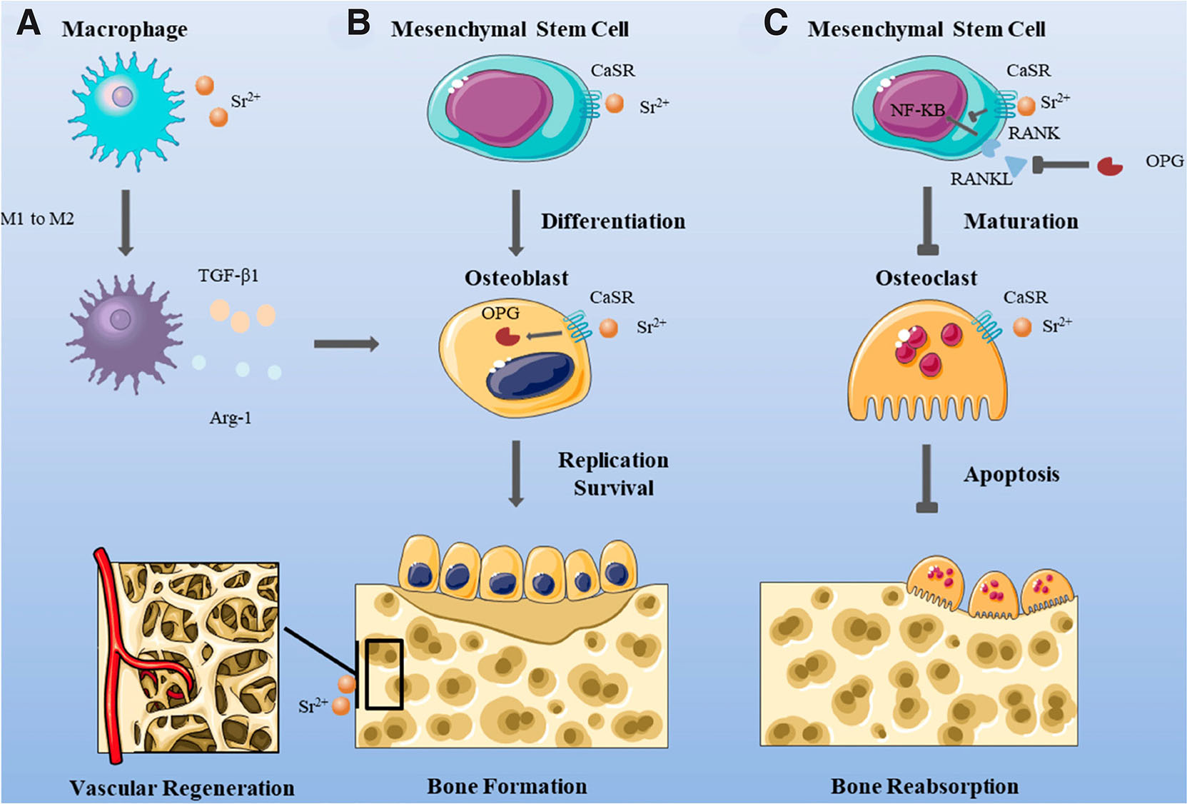 (A) Sr induces macrophage differentiation towards M2 not M1, which is conducive to promoting osteoblast proliferation, and Sr also promotes early vascular regeneration. (B) Sr promotes the differentiation of mesenchymal stem cell and the proliferation of osteoblasts, which is conducive to bone formation. (C) Sr can inhibit the differentiation of mesenchymal stem cell and the proliferation of osteoclasts, thus reducing bone resorption. Source: Liu et al., 2023. Licensed under CC BY 4.0.