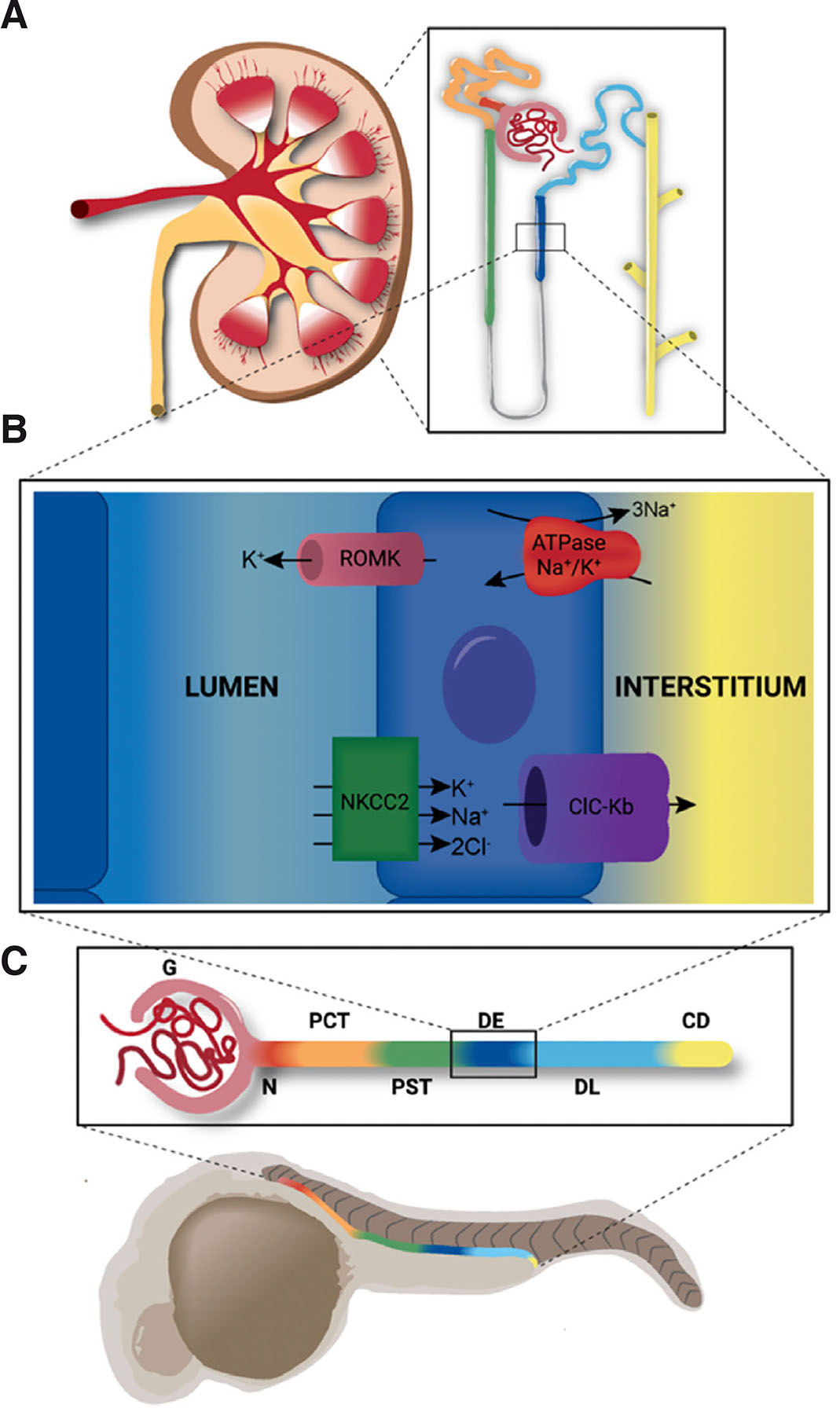 Zebrafish organs exhibit fundamentally similar structure and function to those of mammals. (A) The fully formed mammalian metanephric kidney is comprised of hundreds of thousands of nephrons (inset). (B) The thick ascending limb of the mammalian kidney is analogous to the distal early segment of the zebrafish. These segments share similar functions and express the same suite of solute transporters, including ROMK (encoded by kcnj1a1.1 in zebrafish), ATPase Na+/K+ (encoded by atp1a1a.1 in zebrafish), NKCC2 (encoded by slc12a1 in zebrafish), and ClC-Kb (encoded by clcnk in zebrafish). (C) The zebrafish pronephros shares similar segmentation with the mammalian nephron (color-coding). The pronephros is comprised of the glomerulus (G), neck (N), proximal convoluted tubule (PCT), proximal straight tubule (PST), distal early (DE), distal late (DL) and collecting duct (CD).