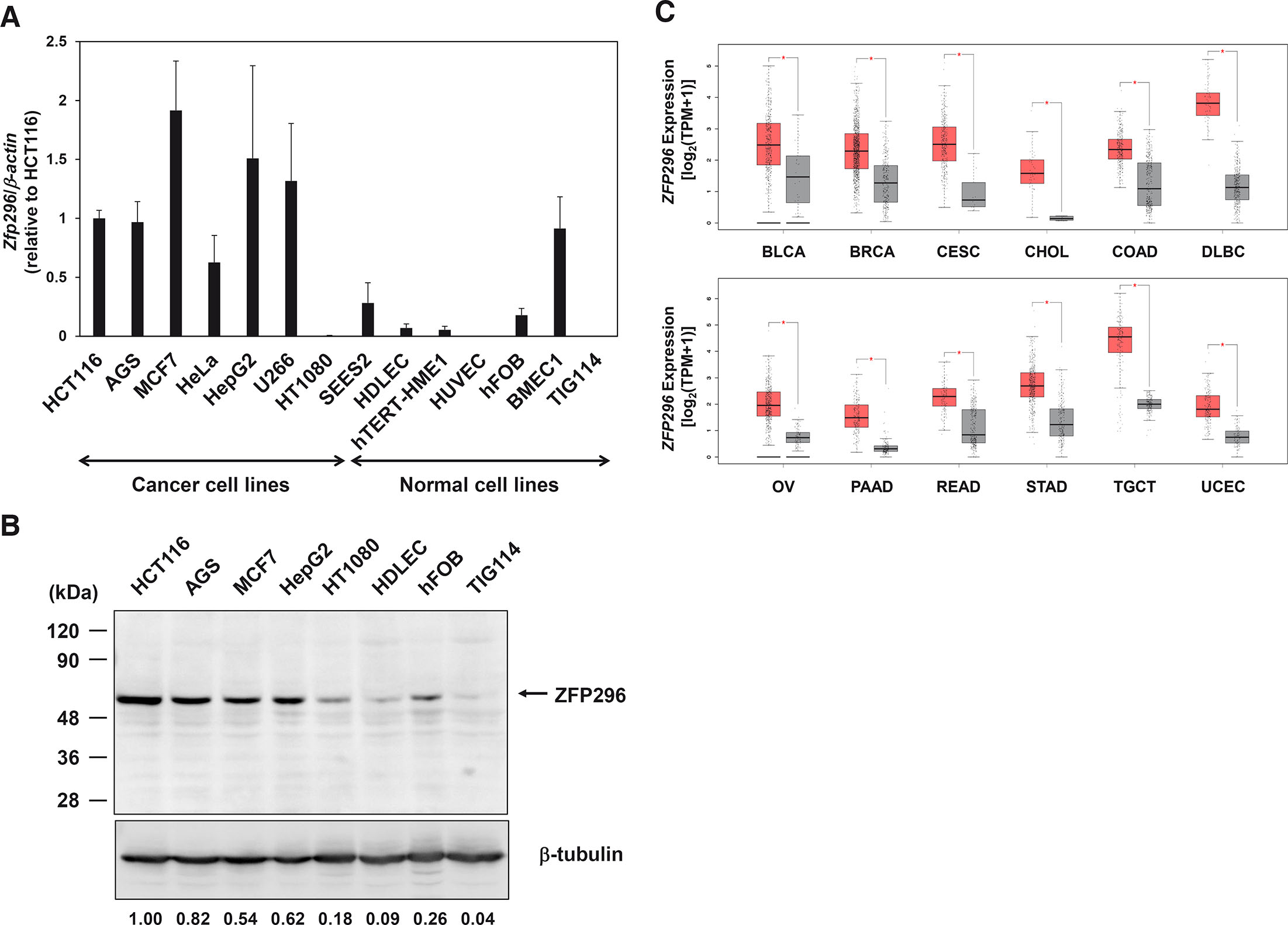 (A) Real-time RT-qPCR analyses were carried out using total RNA extracted from the following cell lines: HCT116 (colon cancer), AGS (gastric cancer), MCF7 (breast cancer), HeLa (cervical cancer), HepG2 (liver cancer), U266 (myeloma), HT1080 (fibrosarcoma), SEES2 (ES cells), HDLEC (dermal lymphatic endothelium), hTERT-HME1 (mammary epithelium), HUVEC (umbilical vein endothelium), hFOB (fetal osteoblast), BMEC1 (bone marrow microvascular endothelium), and TIG114 (fibroblast). Data were normalized to the expression level in HCT116 cells and are represented as the mean ± standard error (n ≥ 3). (B) Western blot analyses were carried out using total cell lysate from the indicated cell lines. The numbers below the gel indicate the expression level of ZFP296 in each cell line relative to that in HCT116. (C) Expression of ZFP296 mRNA in several human tumors (red box) and normal tissues (grey box). All data are shown in Fig. S2, and only cancers with significantly higher expression of Zfp296 in tumor tissue compared to normal tissue are shown here. Abbreviations: BLCA, bladder urothelial carcinoma; BRCA, breast invasive carcinoma; CESC, cervical squamous cell carcinoma and endocervical adenocarcinoma; CHOL, cholangiocarcinoma; COAD, colon adenocarcinoma; DLBC, diffuse large B-cell lymphoma; OV, ovarian serous cystadenocarcinoma; PAAD, pancreatic adenocarcinoma; READ, rectum adenocarcinoma; STAD, stomach adenocarcinoma; TGCT, testicular germ cell tumors; UCEC, uterine corpus endometrial carcinoma. *P<0.01.