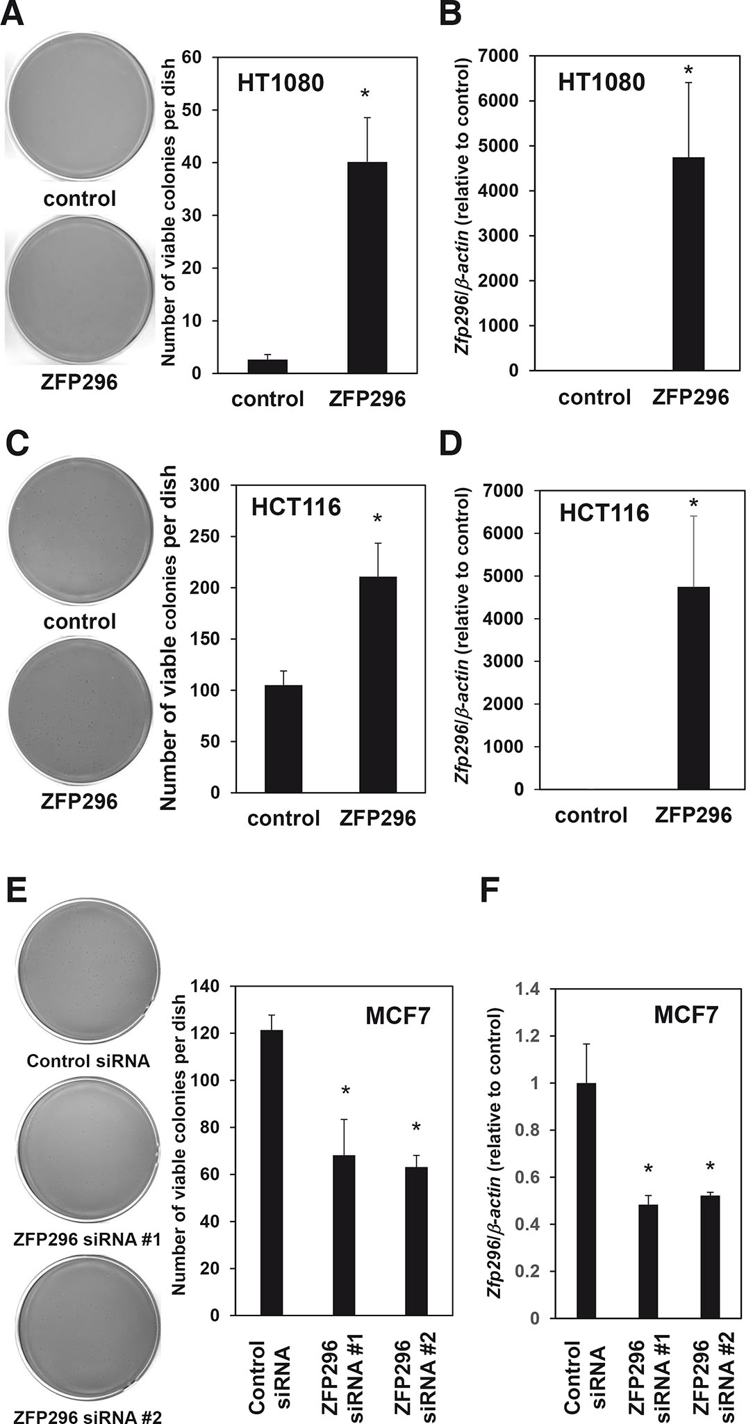 (A) The effect of overexpression of ZFP296 on the anchorage-independent growth of HT1080 cells. Cells (12,000) were cultured in soft agar and the numbers of colonies stained with MTT were counted. Representative scanned images (left panel) and the number of stained colonies (right panel) are shown. (B) Real-time RT-qPCR analysis confirming the overexpression of ZFP296 in HT1080 cells. Data were normalized to the level in control cells. (C) The effect of overexpression of ZFP296 on the anchorage-independent growth of HCT116 cells. Cells (1,200) were cultured in soft agar, and the number of colonies stained with MTT was counted. Representative scanned images (left panel) and the number of stained colonies (right panel) are shown. (D) Real-time RT-qPCR analysis confirming the overexpression of ZFP296 in HCT116 cells. Data were normalized to the level in control cells. (E) The effect of siRNA-mediated knockdown of ZFP296 on anchorage-independent growth of MCF7 cells. Cells (600) were cultured in soft agar and the numbers of colonies stained with MTT were counted. Representative scanned images (left panel) and the number of stained colonies (right panel) are shown. (F) Real-time RT-qPCR analysis confirming the knockdown of ZFP296 in MCF7 cells. Data were normalized to the level in control cells. In all experiments, data are represented as the mean ± standard error (n = 3); *P < 0.05.