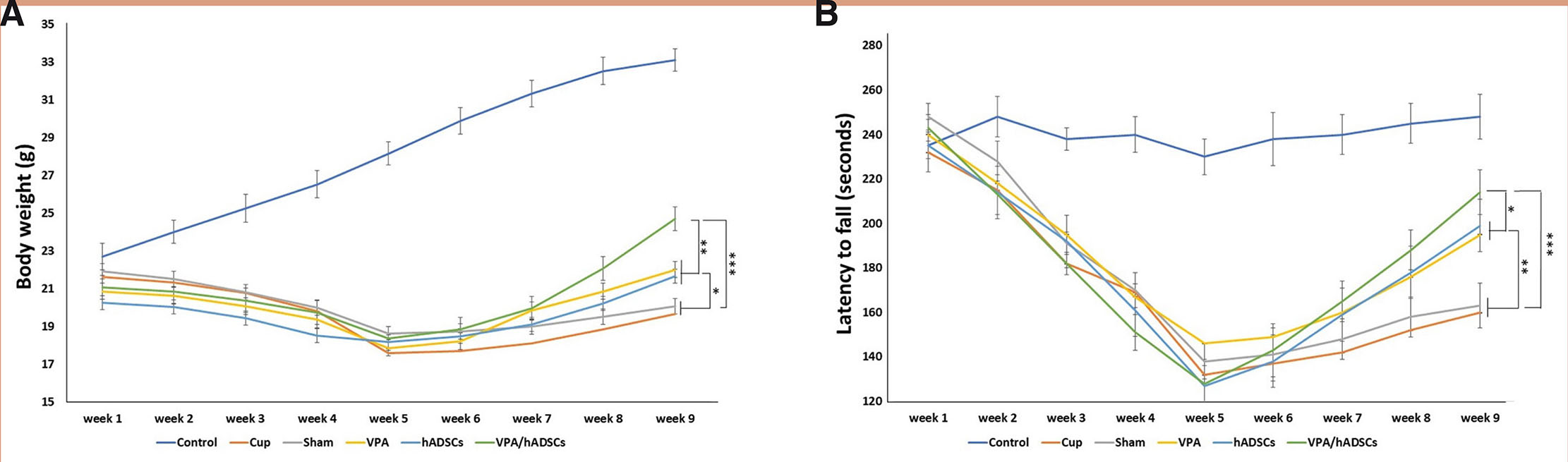 (A) Comparing the body weight of mice showed that the use of cuprizone led to weight loss, and after received of VPA and hADSCs, body weight increased significantly compared with other groups. (B) Hanging wire test also, showed a significant improvement in the motor function of mice after receiving hADSCs and VPA. Groups: Cuprizone (Cup), valproic acid (VPA), human adipose derived stem cells (hADSC), and VPA/hADSC. (*P < 0.05, **P < 0.01, ***P < 0.001).