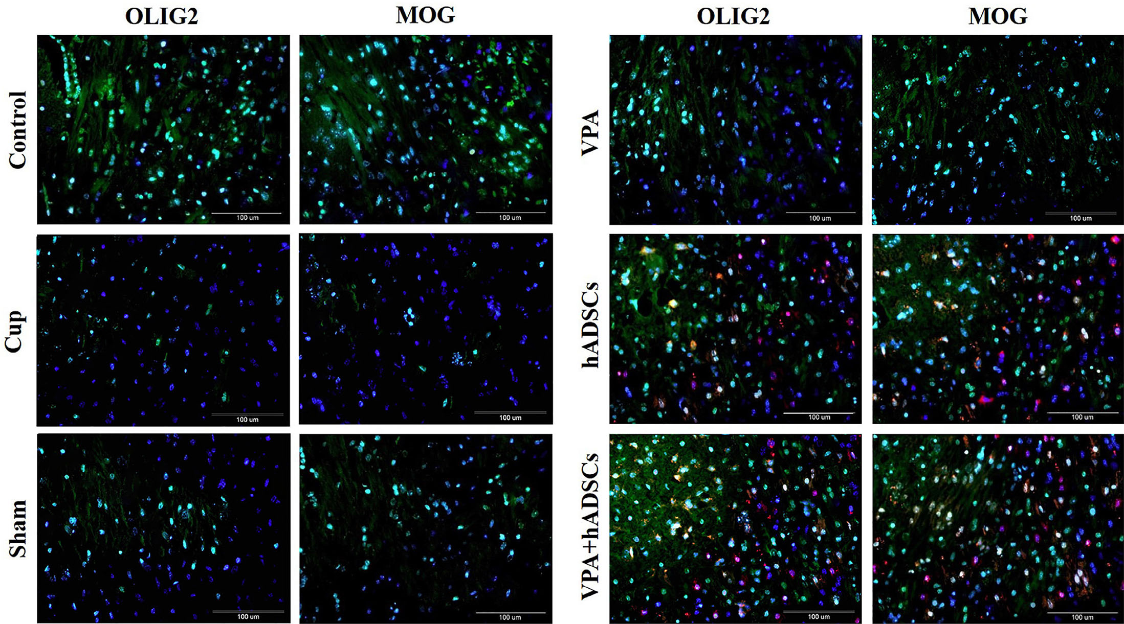 PKH26- labeled hADSCs (red) were shown around the nucleus, labeled blue with DAPI. The OLIG2 and MOG markers were expressed by PKH26+ cells. Groups: cuprizone (Cup), valproic acid (VPA), human adipose derived stem cells (hADSCs), and VPA/hADSCs. Scale bar, 100 µm.