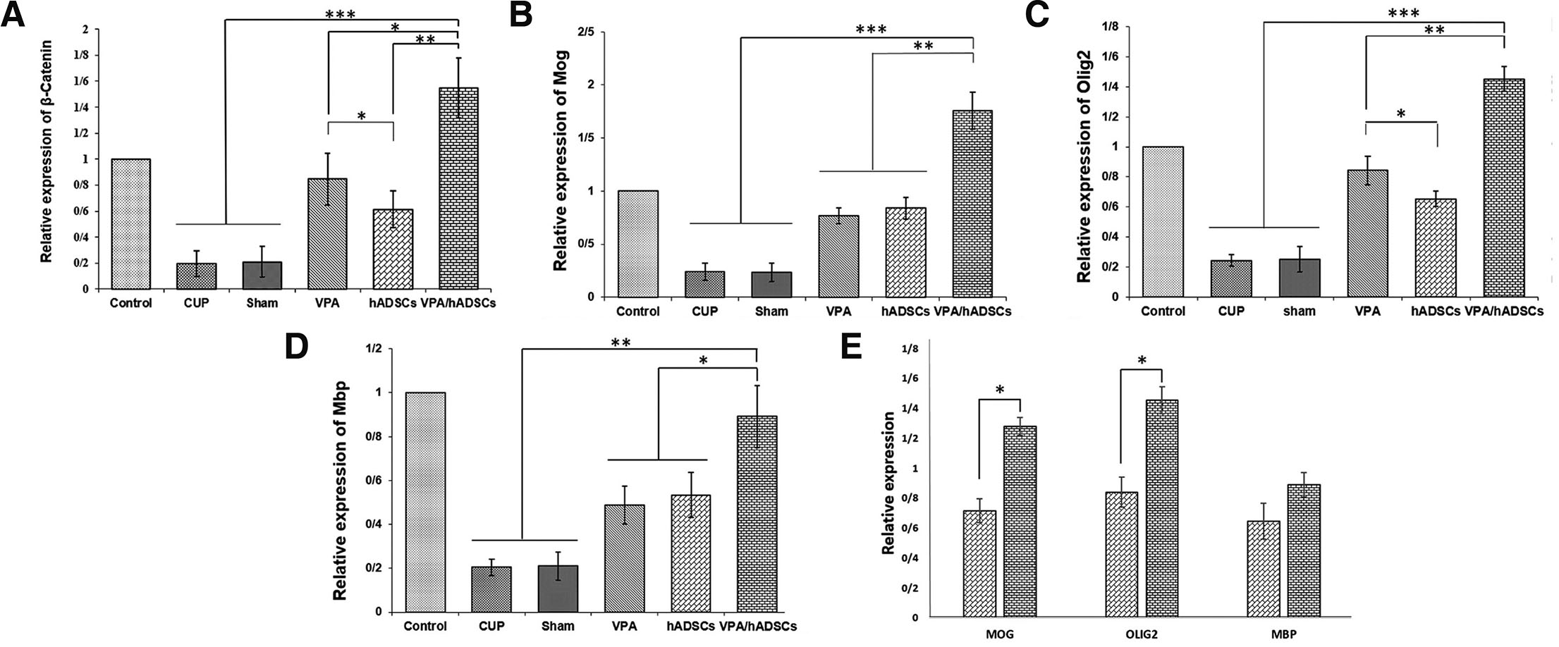 (A-D) Results showed a significant upregulation of β-catenin, Mbp, Olig2 and Mog in VPA and hADSC treated groups, compared with untreated groups. (E) Comparison of the expression of human MBP, OLIG2 and MOG found in the hADSC and VPA/hADSC groups. The simultaneous use of VPA/hADSC had a significant increase in the expression of MOG and OLIG2 genes. Groups: Cuprizone (Cup), Valproic Acid (VPA), human Adipose Derived Stem Cells (hADSCs), and VPA/hADSCs. (*P < 0.05, **P < 0.01, ***P < 0.001).