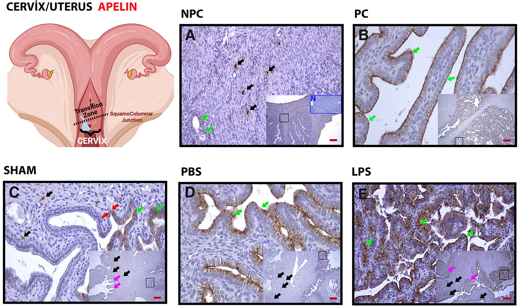 When the cervix tissues were examined in the non-pregnant group, it was observed that some specific cells performed apelin expression at the cervix (Fig. 1A, black arrows). Expression in the epithelium was relatively weak. Expression in epithelial tissue increased with pregnancy in the uterus (Fig. 1. B-D, green arrows). Expression increased significantly from a certain point in the transition area from the cervix to the uterus (Fig. 1C, red arrows). In the group given LPS, expression in the epithelium was more intense compared to the other groups (Fig. 1E, green arrows). Staining in the vaginal fornix and external os epithelium, especially in the basal area, was increased in the LPS group compared to the control groups (Fig. 1. A-E, pink arrows) (Table 1).