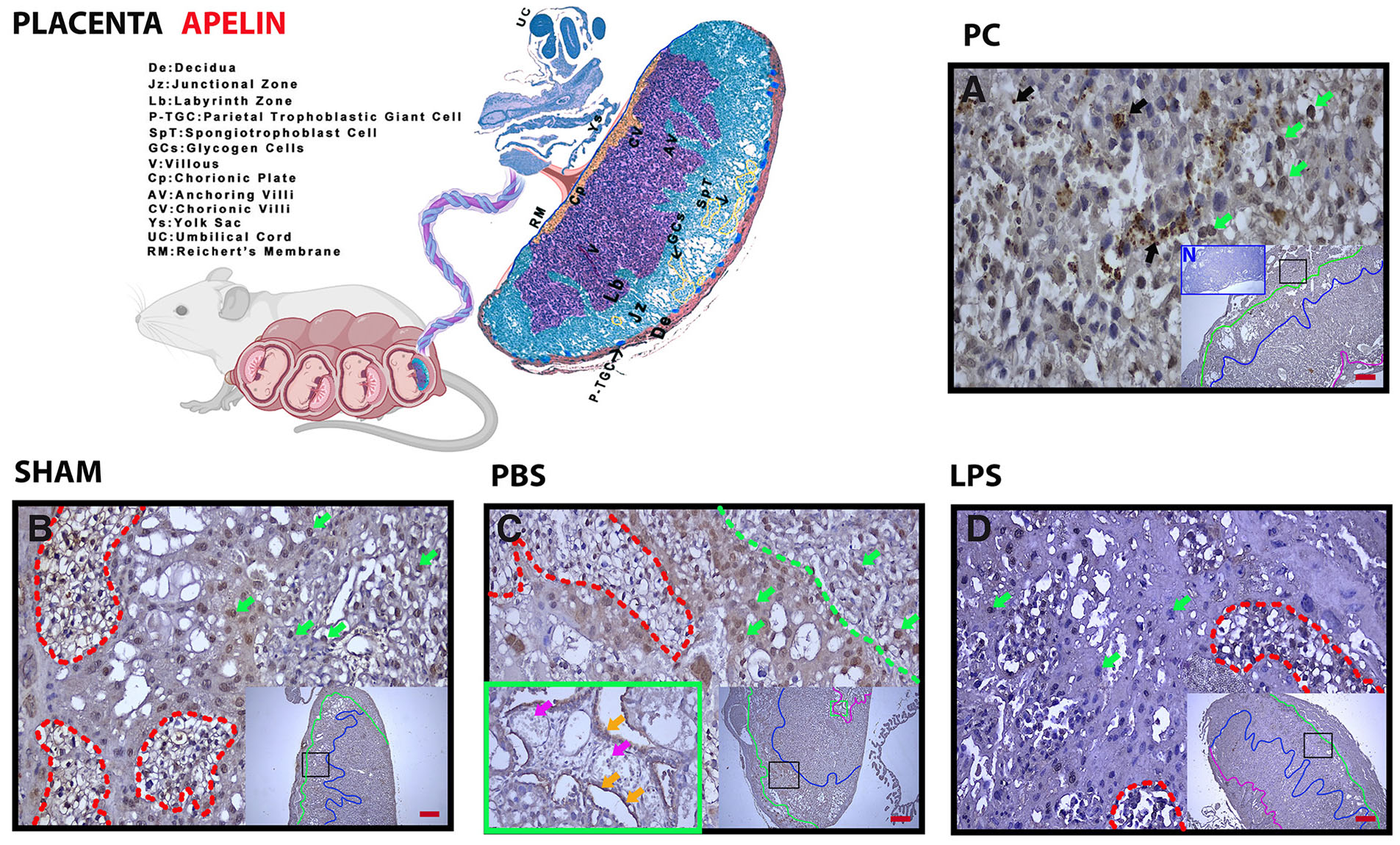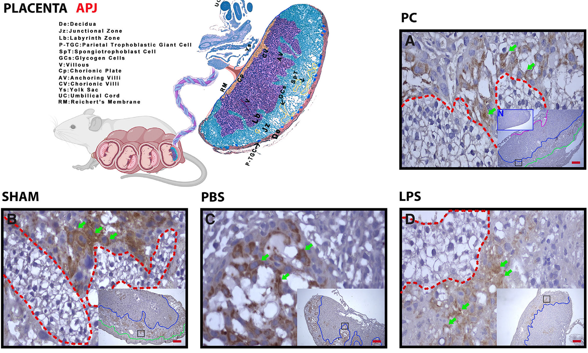 Again, LPS/inflammation seems to disrupt the energy balance of the fetus by affecting apelin secretion in glycogen islets in the placenta. In this process, it was thought that the uterus primarily tried to compensate for the regression through epithelial cells. Decreased APJ in spongiotrophoblasts may indicate a dysregulation in placental hormone regulation. Since apelin tends to increase during pregnancy, it can also be considered essential for maintaining a healthy pregnancy. The threshold value and possible mechanisms of stress and trauma-induced increase in APJ must be investigated. Although it is evident that a complex process needs to be supported by further studies to illuminate it, the new data that our study results will add to the literature will contribute to progress in this regard and encourage the planning of recent studies.