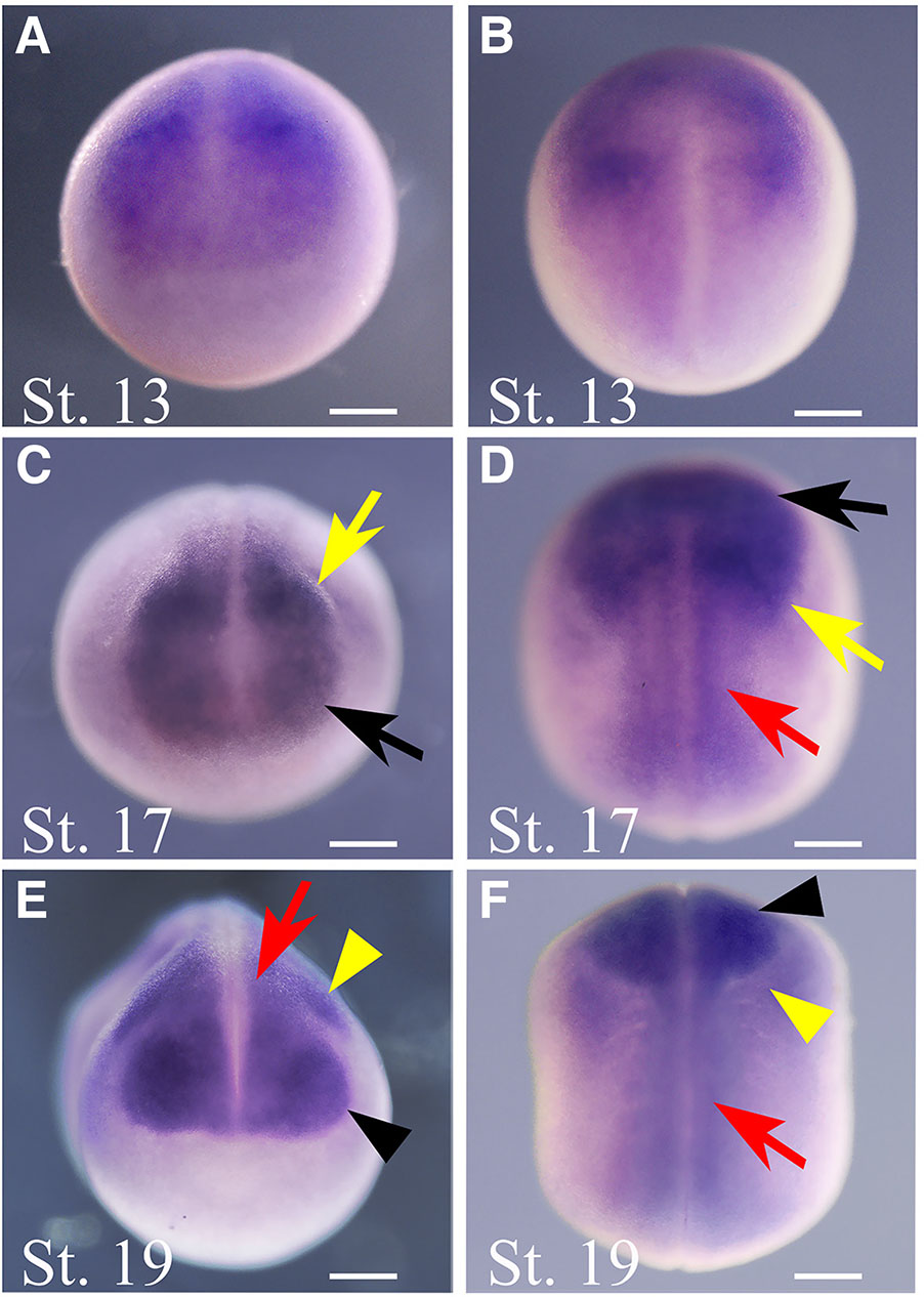 Embryo developmental stages (St.) are indicated at the bottom left corner of each panel. (A,C,E) Frontal view, dorsal to the top, and (B,D,F) dorsal view, frontal to the top, of whole-mount hybridized embryos. Black arrows indicate the anterior neural plate. Yellow arrows point to the neural crests. Red arrows indicate the neural tube. Black arrowheads point to the optic vesicles. Yellow arrowheads indicate migrating neural crest cells. Scale bar: 250 µm.