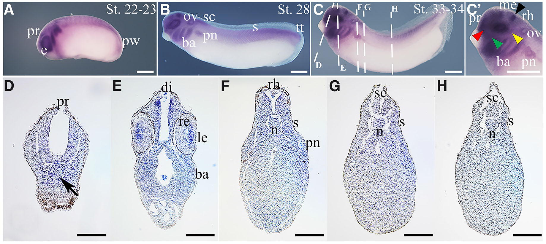 Embryo developmental stages (St.) are indicated at the top right corner of each panel. (A,B,C) Lateral views of whole-mount hybridized embryos, anterior to the left; (C') magnified view of (C). Dashed lines in (C) indicate the section planes shown in (D-H). (D-H) Transverse sections from whole-mount St. 33-34 embryos, dorsal to the top. Black arrow in (D) points to the Rathke’s pouch. Black arrowhead in (C') indicates the midbrain-hindbrain boundary; yellow arrowhead indicates lateral line placode; green arrowhead indicates epibranchial placode, and red arrowhead indicates olfactory placode. Scale bars: 500 µm in (A-C, C’); 250 µm in (D-H). ba, branchial arches; di, diencephalon; e, eye; le, lens; me, mesencephalon; n, notochord; ov, otic vesicle; pn, pronephros; pr, prosencephalon; pw, posterior wall; re, retina; rh, rhombencephalon; s, somites; sc, spinal cord; tt, tail tip.