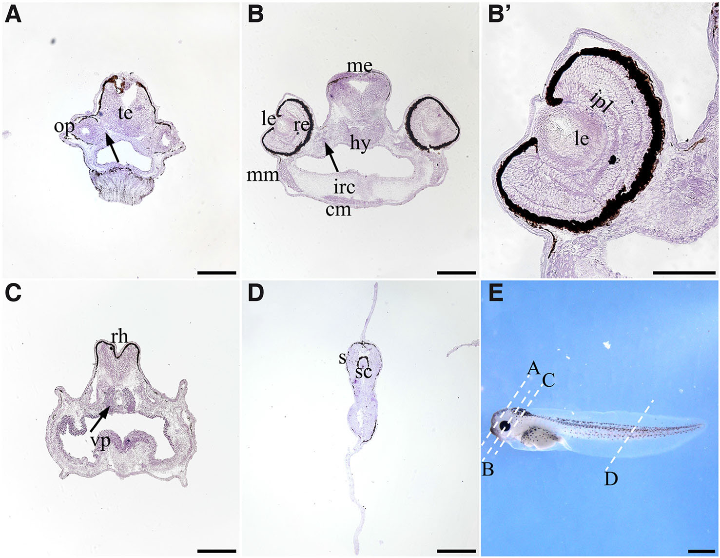 (A,B,B’,C,D) Transverse cryosections, dorsal to the top. (E) Lateral views of the larvae, anterior to the left. Dashed lines in (E) indicate the section planes shown in (A,B,B′,C,D). Black arrows indicate the Jacobson's organ in (A), external ocular muscles in (B), and parachordal cartilages in (C); (B′) high magnification of the eye represented in (B). Scale bars, 200 μm in (A,B,C,D); 1 mm in (E) and 100 μm in (B′). cm, cranial muscles; hy, hypothalamus; ipl, inner plexiform layer; irc, infrarostral cartilage; le, lens; me, mesencephalon; mm, mandibular muscles; op, olfactory pit; te, telencephalon; re, retina; rh, rhombencephalon; s, somites; sc, spinal cord; vp, velar plate.