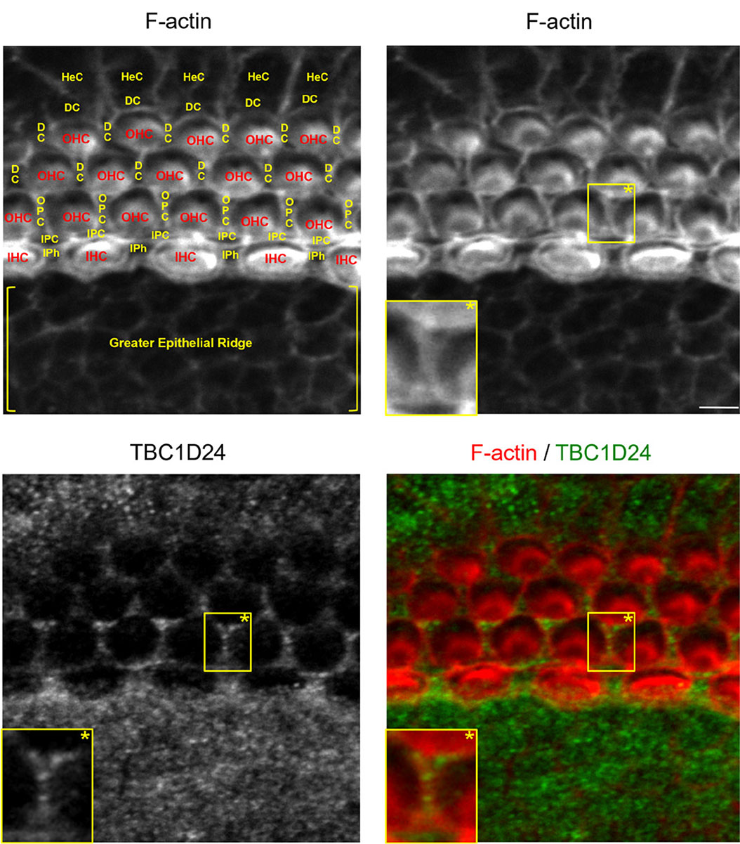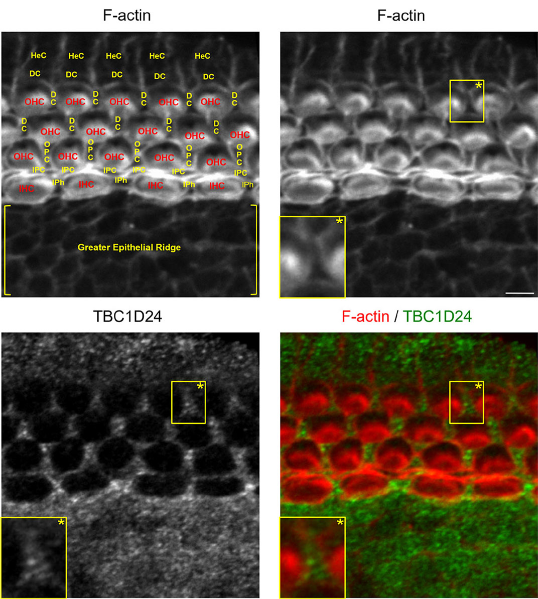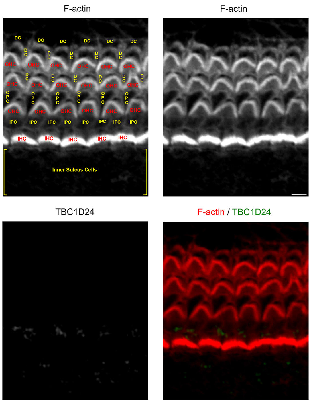 TBC1D24-related non-syndromic hearing loss can be inherited in dominant (DFNA65) or recessive (DFNB86) patterns. DFNA65 is rather associated with progressive postlingual deafness (Azaiez et al., 2014; Oziębło et al., 2021; Zhang et al., 2014), whereas DFNB86 is rather associated with profound prelingual deafness (Rehman et al., 2014). Mouse models of human TBC1D24 pathogenic variants associated with syndromic and non-syndomic forms of deafness DFNA65 and DFNB86 have been engineered. Unexpectedly, no auditory dysfunction was detected in Tbc1d24 mutant mice, although homozygosity for some of the variants caused seizures or lethality (Tona et al., 2020). In the cochlea, Tbc1d24 mRNA and TBC1D24 protein have been detected in auditory neurons (Rehman et al., 2014; Tona et al., 2020), but few reliable and convergent data exist about the sensory epithelium (Azaiez et al., 2014; Tona et al., 2020; Zhang et al., 2014). This could be due to lack of antibody specificity and potential cross-reactivity in immunolabelling. For this reason, I have characterized the expression of TBC1D24 throughout the postnatal maturation of the mouse cochlear sensory epithelium using a polyclonal antibody whose specificity has been previously definitely confirmed (Tona et al., 2019).