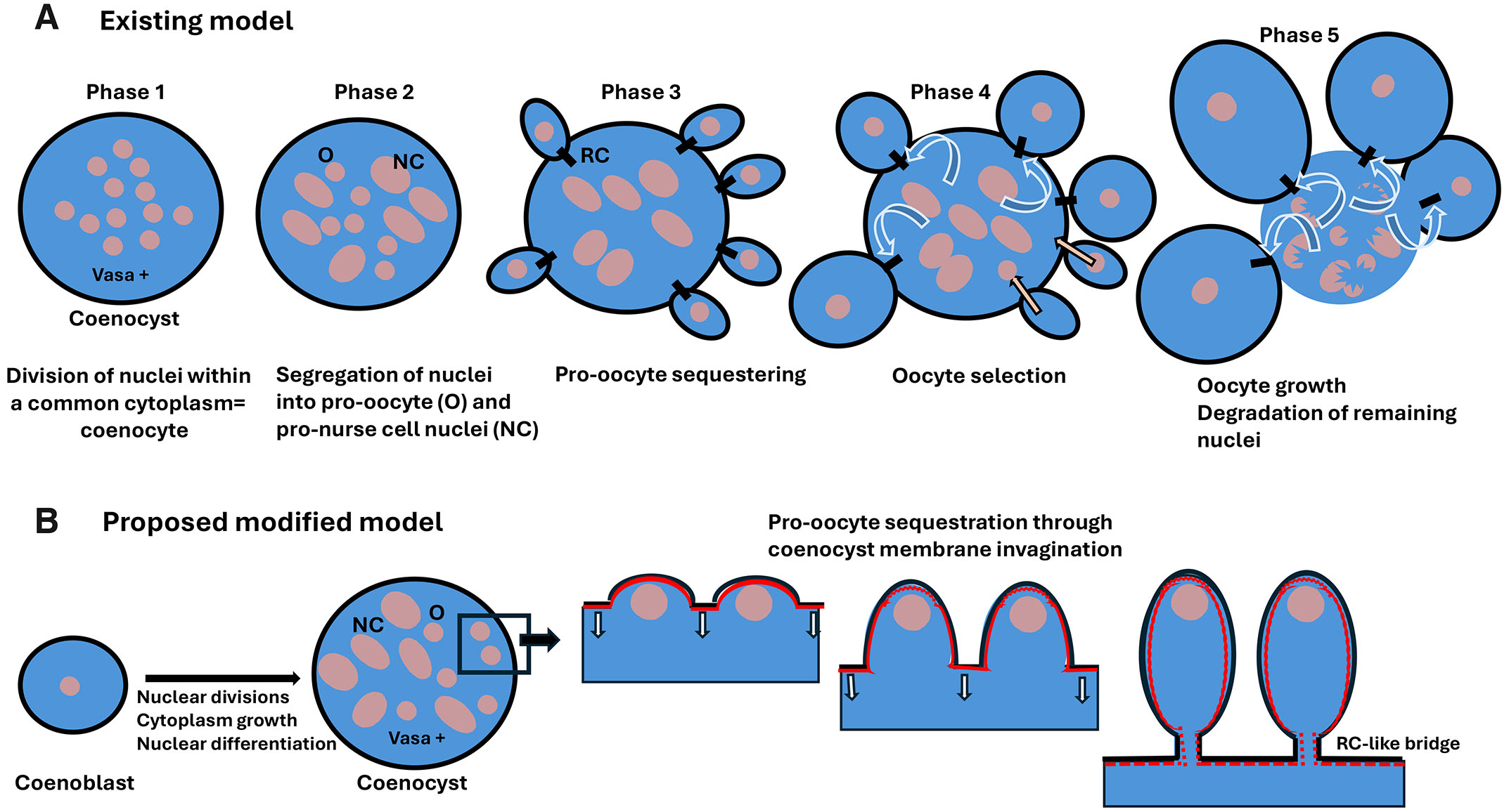 Ganot et al. (2007a, 2007b, 2008) proposed a quintaphasic model of coenocystic oogenesis. In the first phase, there are several nuclear divisions within the common cytoplasm which is positive for the germline marker Vasa protein. In the second phase, nuclei differentiate into two distinct subpopulations: one entering meiosis (prospective oocytes) and another endoreplicating (prospective nurse cells). In phase 3 the meiotic nuclei become sequestered within small pro-oocytes connected to the common cytoplasm by RCs. In phase 4 some “selected” pro-oocytes grow more than others by engulfing the coenocyst cytoplasm, while the unselected meiotic nuclei move back to the coenocyst cytoplasm toward the nurse cell nuclei. In phase 5, selected oocytes continue to grow into eggs and the remaining nuclei become degraded (Fig. 4).