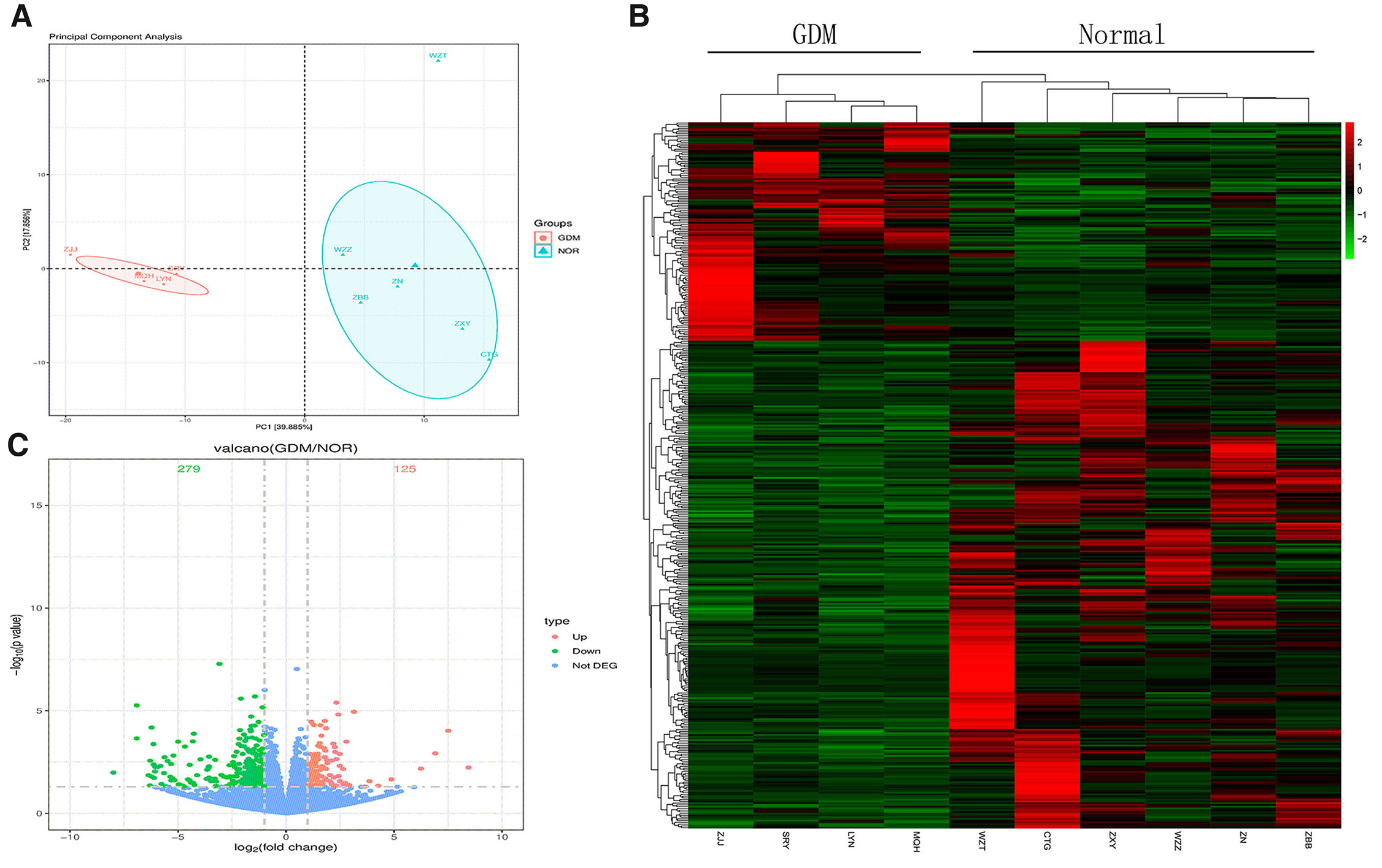 The expression of known genes and transcripts were quantified with Stringtie's analysis process. Gene expression levels of were compared through different grouped samples through FPKM distribution of all genes. Differentially expressed genes (DEGs) between the GDM group and Normal group were analyzed using DESeq2 software. DEGs were identified based on P value<0.05 and |log2 (fold change)|>1. Genes with a log2 (fold change)>1 were marked as upregulated, while those with a log2 (fold change) <-1 were marked as downregulated. Genes that did not meet these criteria were not considered as DEGs.