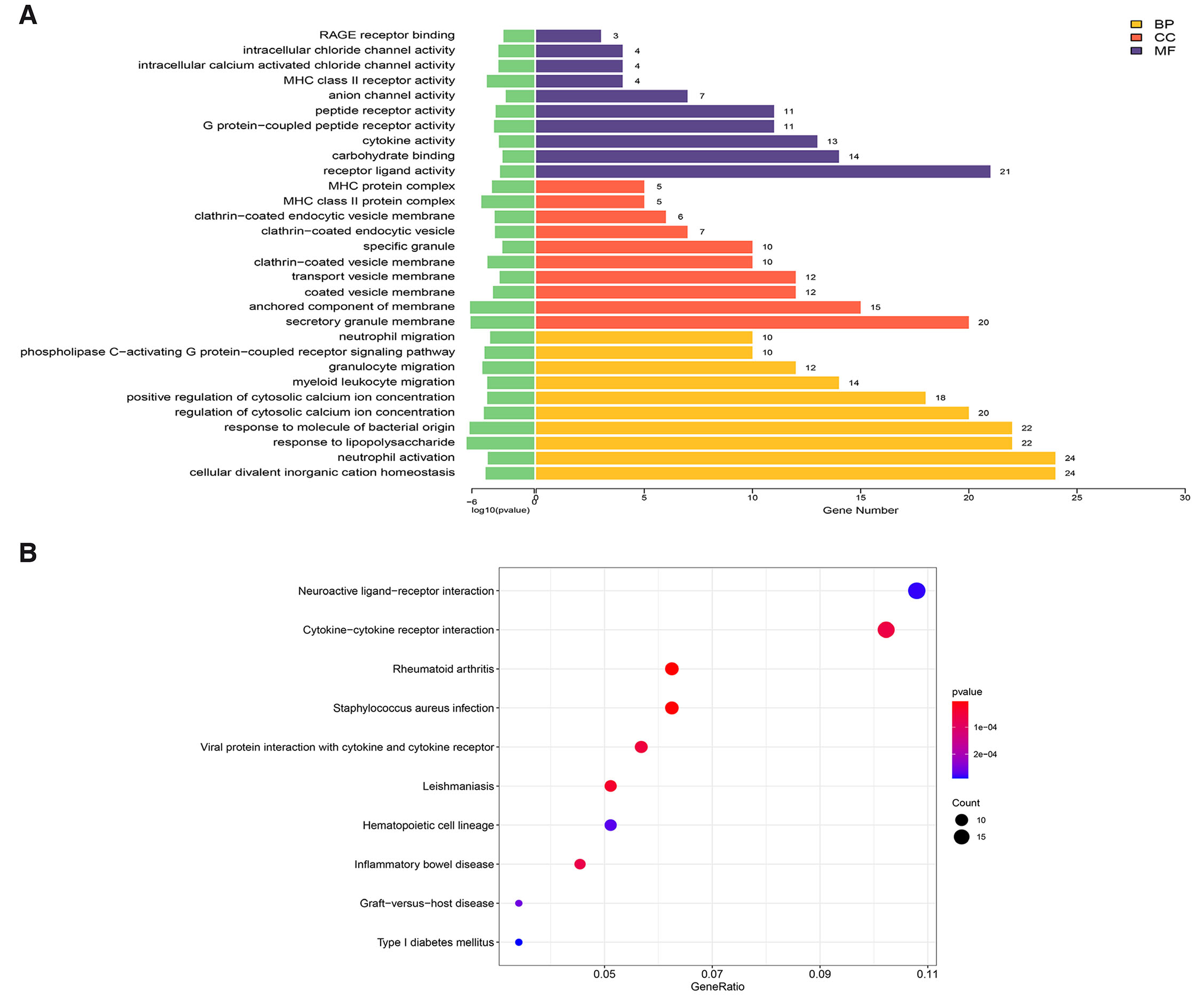 The DEGs between the GDM group and the Normal group were subjected to GO annotation analysis. The functional enrichment categories were classified into three main categories: biological process, cellular component, and molecular function. For each category, GO terms with more than two DEGs were selected, resulting in a total of 10 terms chosen based on their -log10 P values. The top 10 enriched GO terms encompassed RAGE receptor binding, intracellular chloride channel activity, MHC class II receptor activity, anion channel activity, peptide receptor activity, etc. Regarding cellular components, the main findings included MHC protein complex, MHC class II protein complex, clathrin-coated endocytic vesicle membrane, clathrin-coated endocytic vesicle membrane, etc. The key biological processes identified included neutrophil migration, phospholipase C-activating G protein-coupled receptor signaling pathway, granulocyte migration, myeloid leukocyte migration, positive regulation of cytosolic calcium ion concentration, etc. (Fig. 2A).