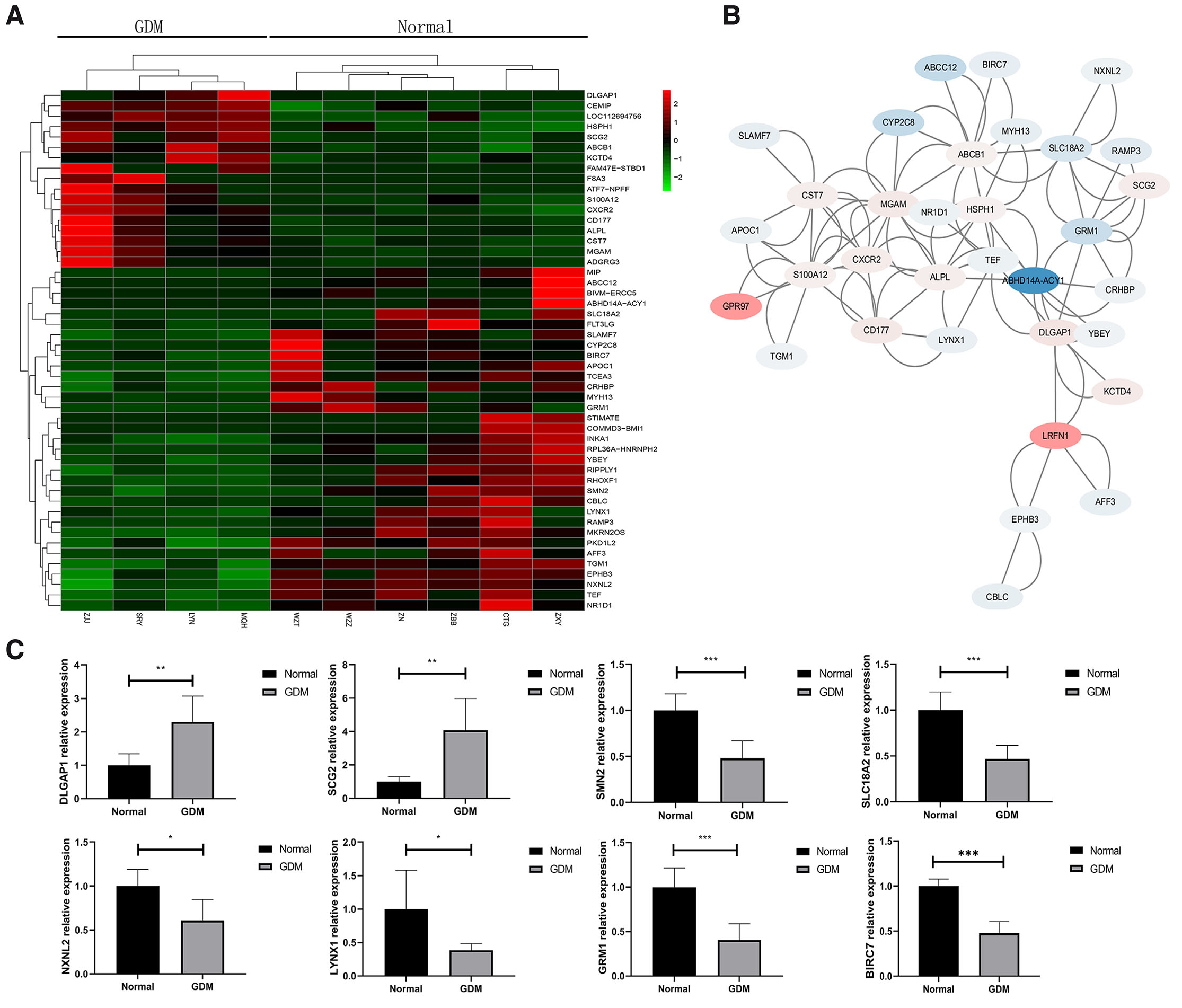 (A) Heatmap of top 50 DEGs between the GDM and Normal groups. The x-axis is sample code, and the y-axis is gene terms. (B) The PPI network of DEGs between the GDM and Normal groups. (C) Verification of mRNA levels of 8 genes related to neuronal maturation, apoptosis and signal transduction in the top 50 DEGs of the GDM and Normal groups. Levels of statistical significance: * P<0.05, **P<0.01, ***P<0.001.