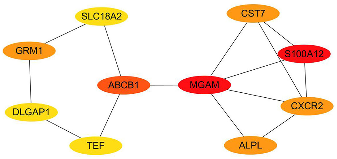 The PPI analysis was conducted on the top 50 DEGs, 8 DEGs of DLGAP1, SCG2, SMN2, SLC18A2, NXNL2, LYNX1, GRM1 and BIRC7 were related to neurodevelopment (Table 1). Ten Hub genes were screened from the top 50 genes using Cytoscape software (Fig. 4), revealing that DLGAP1, SLC18A2, and GRM1 play pivotal roles in neurodevelopment, but TEF, MGAM, CXCR2, ABCB1, ALPL, CST7 and S100A12 were not associated with neurodevelopment. Specifically, DLGAP1 primarily contributes to the formation of neuronal synapses, while SLC18A2 is responsible for the transportation of cytoplasmic monoamine substances, including dopamine, norepinephrine, serotonin, and histamine, into synaptic vesicles. Moreover, SLC18A2 is involved in the ATP dependent vesicular transport of biogenic amine neurotransmitters. On the other hand, GRM1 is a glutamate G protein coupled receptor that activates the phosphatidylinositol calcium second messenger system through G protein triggered signaling. It is also involved in the central role of glutamate in the central nervous system, such as long-term enhancement of the hippocampus and long-term inhibition of the cerebellum. TEF is the thyrotroph embryonic factor, and it binds to and transactivates the TSHB promoter. MGAM is maltase-glucoamylase, and it serves as an alternate pathway for starch digestion when luminal alpha-amylase activity is reduced because of immaturity or malnutrition. It plays a unique role in the digestion of malted dietary oligosaccharides used in food manufacturing. CXCR2 is C-X-C chemokine receptor type 2, and is receptor for interleukin-8, which is a powerful neutrophil chemotactic factor. Binding of IL-8 to the receptor causes activation of neutrophils. ABCB1 is multidrug resistance protein 1, and energy-dependent efflux pump responsible for decreased drug accumulation in multidrug-resistant cells. ALPL is alkaline phosphatase, and is tissue-nonspecific isozyme, which may play a role in skeletal mineralization. CST7 is cystatin-F; it inhibits papain and cathepsin L, and it may play a role in immune regulation through inhibition of a unique target in the hematopoietic system. S100A12 is protein S100-A12, and is a calcium-, zinc- and copper-binding protein which plays a prominent role in the regulation of inflammatory processes and immune response. Its pro-inflammatory activity involves recruitment of leukocytes, promotion of cytokine and chemokine production, and regulation of leukocyte adhesion and migration.