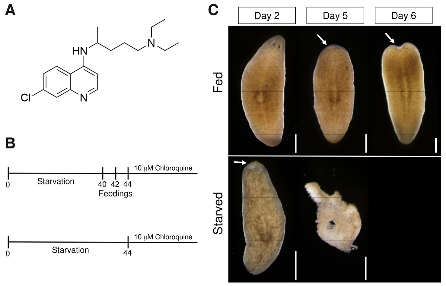 (A) Molecular structure of chloroquine. (B) Schedule of starvation period, feeding and chloroquine treatment. Two groups of planarians were starved for 40 days. The “Fed” group was fed on days 40, 42, and 44, while the “Starved” group was not fed on these days. Both groups were treated with 10 µM chloroquine and monitored for tissue maintenance phenotypes every 24 h for the duration of the experiment. (C) Representative images demonstrating the effects of chloroquine treatment on whole unamputated animals. In both “Fed” and “Starved” groups, chloroquine induced head regression (arrows) and subsequent tissue lysis. Scale bars: 500 µm.