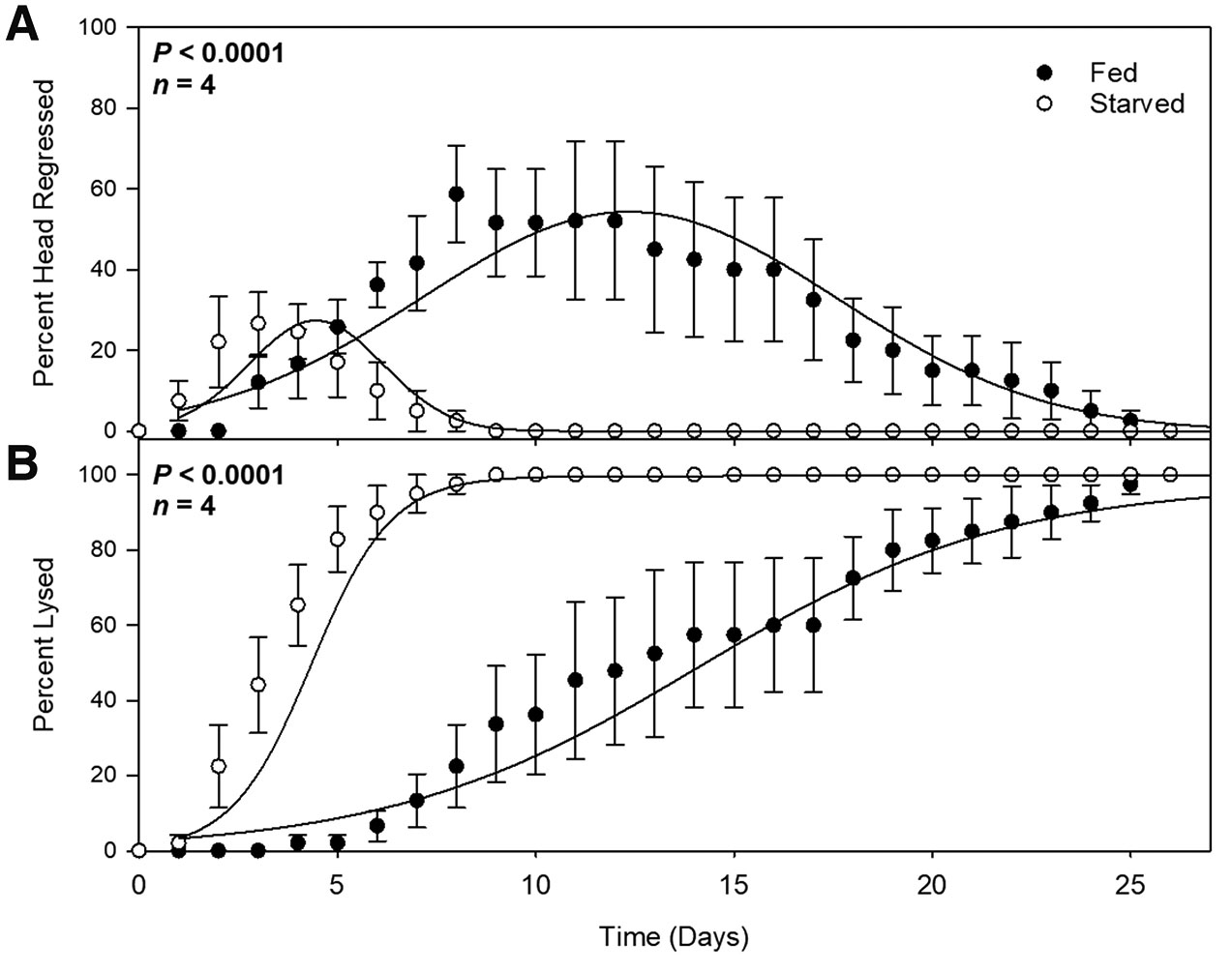 Quantifications of percentage of planarians exhibiting head regression (A) or tissue lysis (B) in “Fed” (closed circles) and “Starved” (open circles) groups over twenty-five days. Each data point represents a daily average. N=4 independent replicates (9-10 animals per treatment, per experiment). Error bars indicate standard error, and probability values were calculated using analysis of variance with repeated measures using a General Linear Mixed Model (PROC GLIMMIX, SAS Studio 3.82).