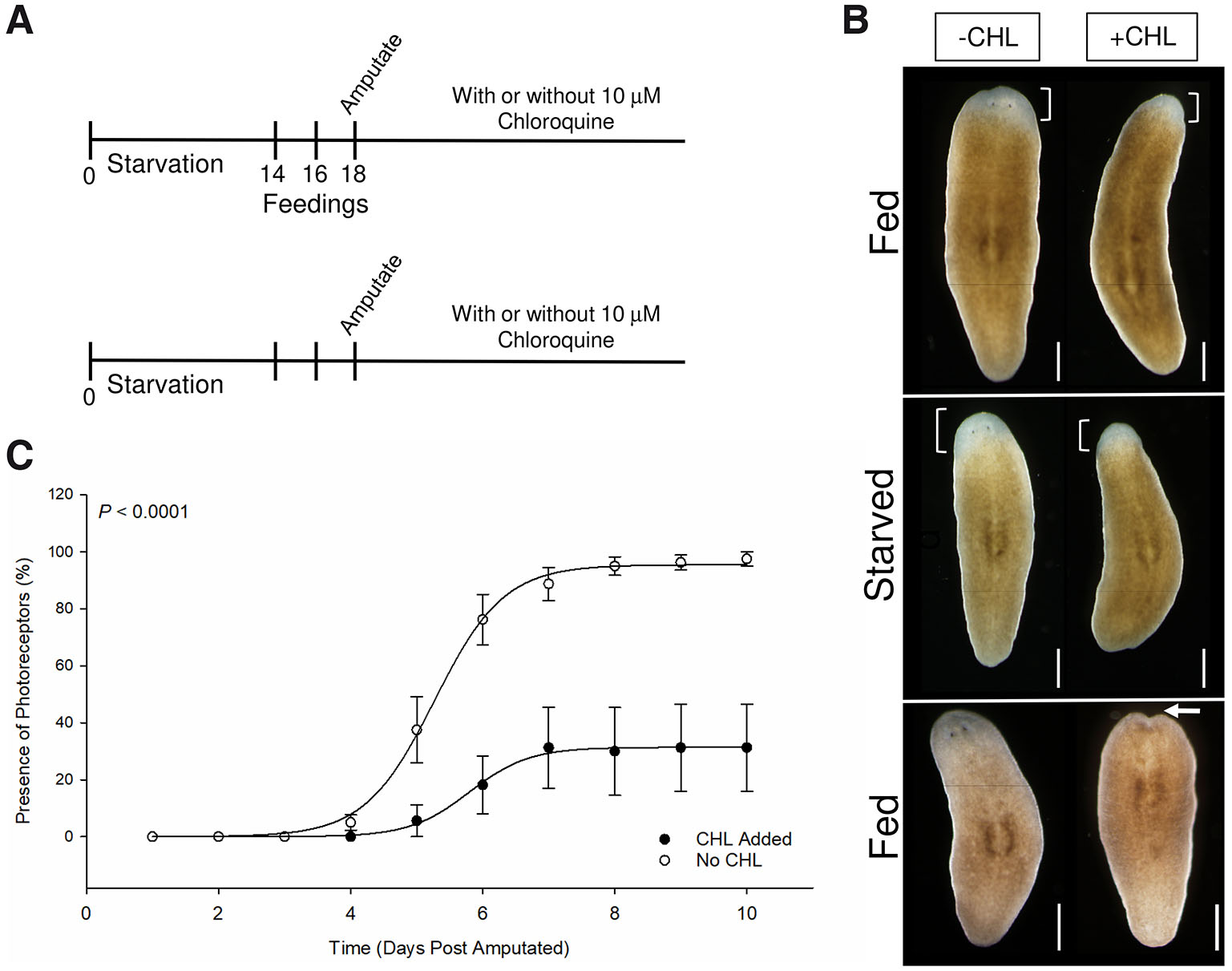 For each experiment, 40 planarians were starved for 14 days prior to being separated into two equal numbered groups. One group (“Fed”) was fed pureed calf liver on days 14, 16, and 18 while the other group (“Starved”) was not fed on those days. On day 21, all planarians were transversely amputated anterior to the pharynx and both “Fed” and “Starved” groups divided into two equal numbered groups (“-Chl” and “+Chl”). While the “-Chl” groups were left untreated, the “+Chl” groups were treated with 10µM chloroquine in planarian water starting on day 21. Chloroquine was replaced every 48 hours for the duration of the experiment. We monitored planarians daily for blastema and photoreceptor regeneration. This experiment was replicated four times.