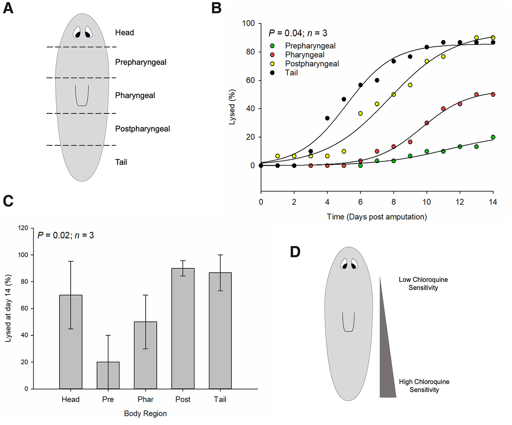 For each experiment, 20 planarians were starved for 14 days. On day 14, all planarians were transversely amputated along four amputation planes along the A/P axis, giving rise to head, pre-pharyngeal, pharyngeal, post-pharyngeal and tail fragments. 10 control and 10 chloroquine-treated fragments from each A/P position were placed into their own container. While the control group was left untreated, the chloroquine-treated group was treated with 10 µM chloroquine in planarian water starting on day 14. Chloroquine was replaced every 24 hours for the duration of the experiment. We monitored planarians daily for tissue lysis/death. This experiment was replicated three times.