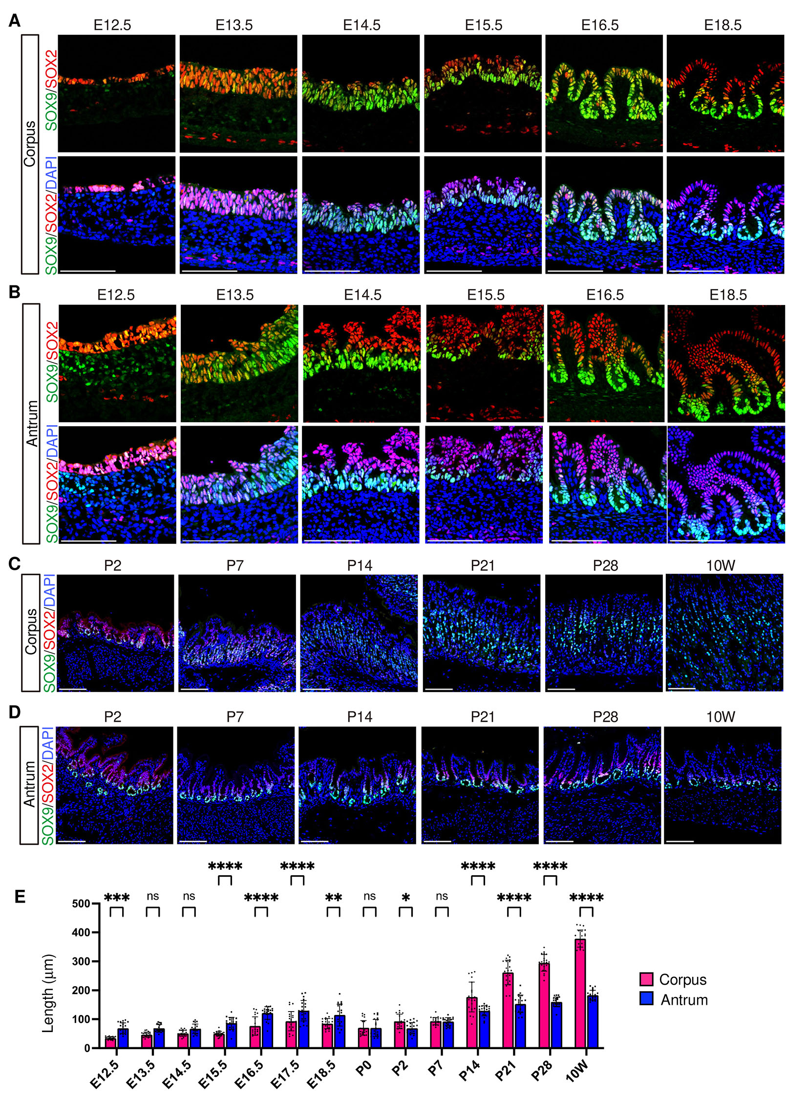 >(A–D) Representative immunofluorescence images showing SOX9 (green) and SOX2 (red) expression, with nuclei counterstained with DAPI (blue). (A,B) Embryonic expression in the corpus (A) and antrum (B). (C,D) Postnatal expression in the corpus (C) and antrum (D). Images are representative of n = 3 embryos or mice per stage. Scale bars, 100 μm. E, embryonic day; P, postnatal day; W, week. This convention is used throughout for all figures. (E) Comparison of epithelial length between the corpus and the antrum. At early developmental stages before gland formation, epithelial thickness was measured at seven positions per embryo, whereas gland length was measured in seven glands per mouse at later stages (n = 3 embryos or mice per stage). Statistical analysis was performed using two-way ANOVA followed by Šídák’s multiple comparisons test. ns, not significant; *, p < 0.05; **, p< 0.01; ***, p< 0.001; ****, p< 0.0001.