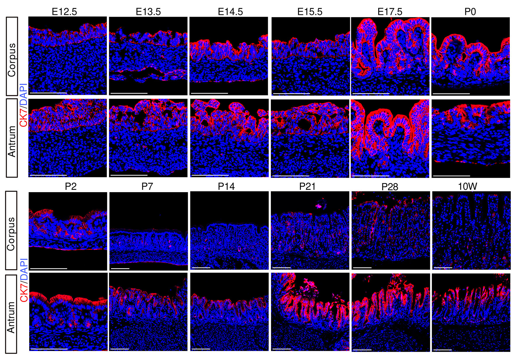 Cytokeratin-7 (CK7), a fetal marker of the human and mouse gastric epithelium (Kirchner et al., 2001; Sankoda et al., 2021), was detectable in the corpus epithelium as early as E12.5, followed by partial reduction at P2 (Fig. 2 and Fig. S2). From P7 onward, CK7 expression was restricted to a small subset of epithelial cells. In the antrum, CK7 was also detected at E12.5; however, unlike in the corpus, CK7 expression persisted in the upper and intermediate regions of the glands until adulthood, while being lost at the gland base from P2 onward.