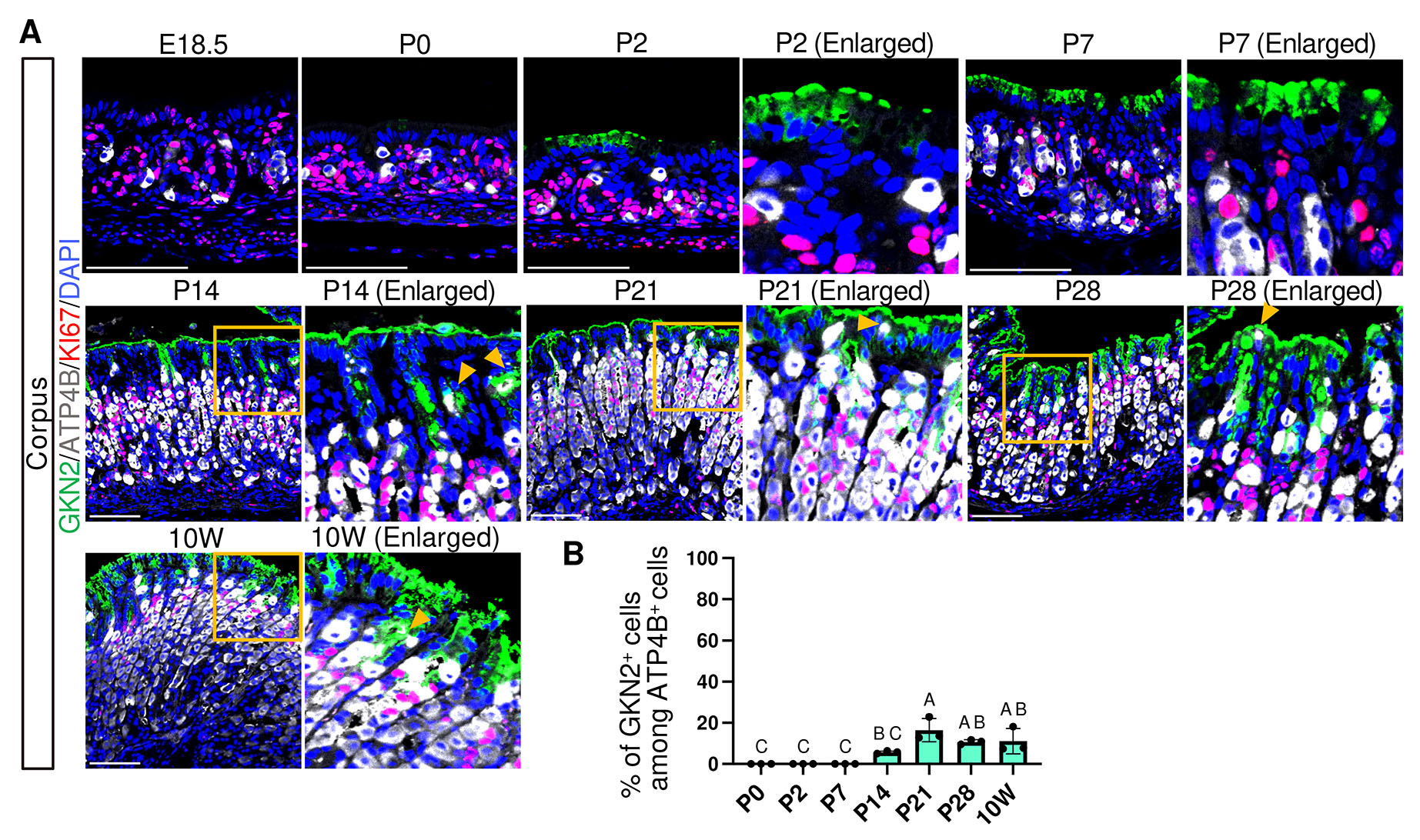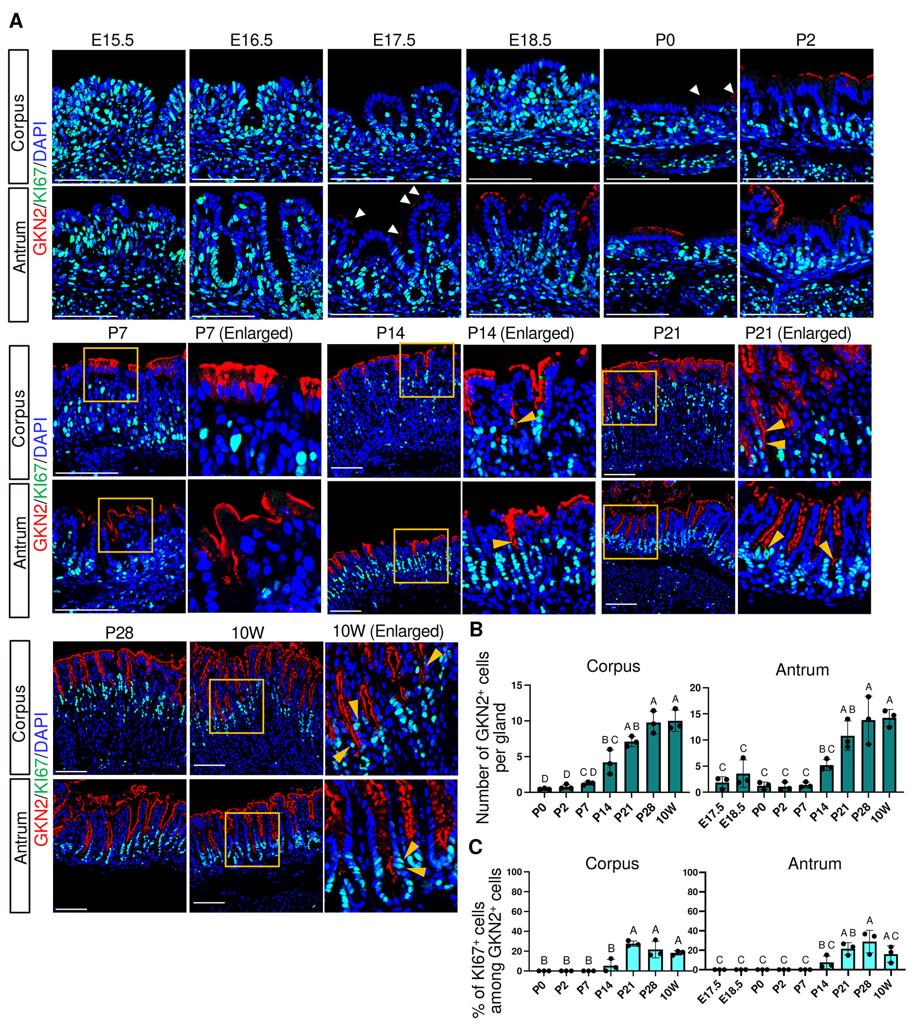 In the adult stomach, rapid pit cell turnover is associated with the presence of proliferating pit cell progenitors at the isthmus region, which exhibit nuclear KI67 expression together with apical GKN2 expression (Fig. 4A, 10W, orange arrowheads). Therefore, we next examined the emergence and dynamics of proliferating pit cell populations during development. KI67⁺/MUC5B⁺ cells were observed at E16.5–E18.5 and were absent at later stages, indicating that proliferating fetal-type pit cells are restricted to very late fetal phase (Fig. 3 A,B). Notably, because MUC5B expression at E16.5 was variable and undetectable in one of three embryos, this stage was excluded from quantitative analysis. In contrast, KI67⁺/GKN2⁺ cells were not detected between P0 and P7 but first appeared by P14 at the isthmus in both the corpus and antrum (Fig. 4 A,C), coinciding with an increase in the number of GKN2+ cells per gland (Fig. 4B). These findings suggest that adult-type pit cell renewal activity is established by P14.