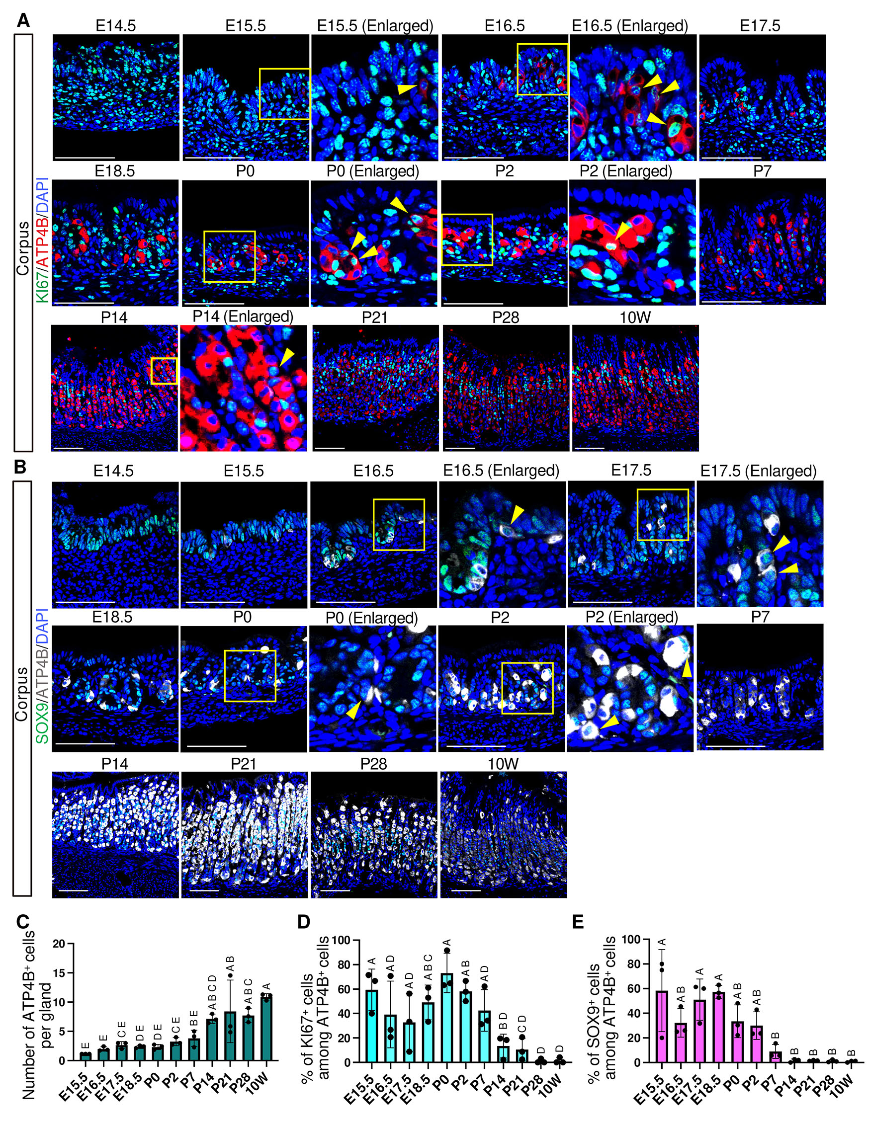 (A) Representative immunofluorescence images showing ATP4B (red) and KI67 (green) expression. (B) Representative immunofluorescence images showing ATP4B (white) and SOX9 (green) expression. For (A) and (B), nuclei were counterstained with DAPI (blue). Images are representative of n = 3 embryos or mice per stage. Scale bars: 100 μm. Yellow arrowheads indicate KI67+/ATP4B+ cells (A) and SOX9+/ATP4B+ cells (B). (C) Developmental changes in the number of ATP4B+ cells per gland. Each data point represents the mean of seven glands per mouse (n = 3 mice per stage). (D) Percentage of KI67-positive cells among ATP4B-positive cells. Each data point represents the mean of seven glands per mouse (n = 3 mice per stage). (E) Percentage of SOX9-positive cells among ATP4B-positive cells. Each data point represents quantification from a single representative image per mouse (n = 3 mice per stage). For (C–E), data are presented as mean ± SD. Statistical analysis was performed using one-way ANOVA followed by Tukey’s multiple comparisons test. Groups not sharing the same letter are significantly different (p < 0.05).