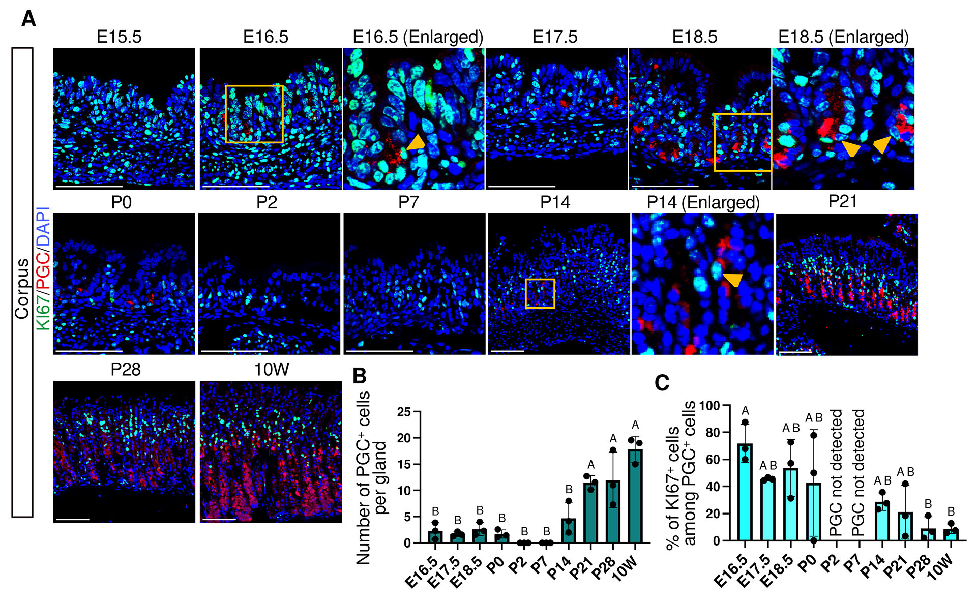 In addition to differentiation, precise regulation of epithelial proliferation is essential for proper gastric development. In the adult corpus, KI67-positive proliferating stem cells are confined to the isthmus region, where they differentiate into pit, neck, and parietal cells and thereby maintain epithelial homeostasis (Han et al., 2019; Matsuo et al., 2021). In contrast, during mid-gestation, KI67-positive cells are broadly distributed throughout the gastric epithelium (Kim et al., 2011). Even during the suckling-to-weaning period when differentiation of multiple lineages is ongoing, KI67-positive cells are not yet confined to the isthmus region, but remain widely distributed along the glands (Mesquita da Silva et al., 2021). However, it remains unclear how the timing of loss of proliferative activity relates to the onset of lineage-specific functional marker expression during these developmental stages.