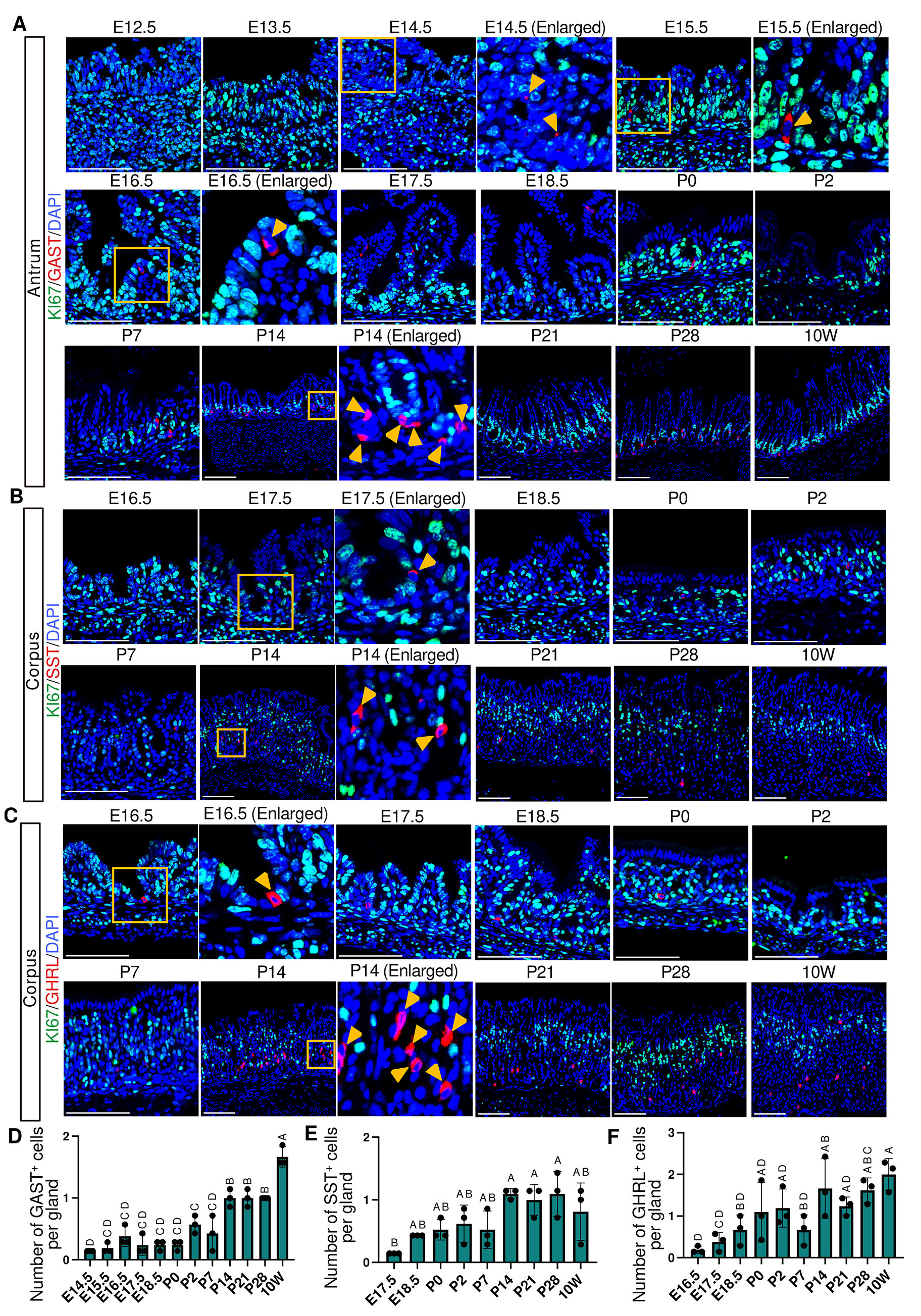 (A-C) Representative immunofluorescence images showing endocrine cell markers and KI67 expression. GAST (red) and KI67 (green) in the antrum (A), SST (red) and KI67 (green) in the corpus (B), and GHRL (red) and KI67 (green) in the corpus (C). For (A–C), nuclei were counterstained with DAPI (blue). Images are representative of n = 3 embryos or mice per stage. Scale bars: 100 μm. Orange arrowheads indicate GAST-positive cells (A), SST-positive cells (B), and GHRL-positive cells (C). (D-F) Developmental changes in the number of GAST+ cells (D), SST+ cells (E), and GHRL+ cells (F) per gland. For (D–F), each data point represents the mean of seven glands per mouse (n = 3 mice per stage). Data are presented as mean ± SD. Statistical analysis was performed using one-way ANOVA followed by Tukey’s multiple comparisons test. Groups not sharing the same letter are significantly different (p < 0.05).