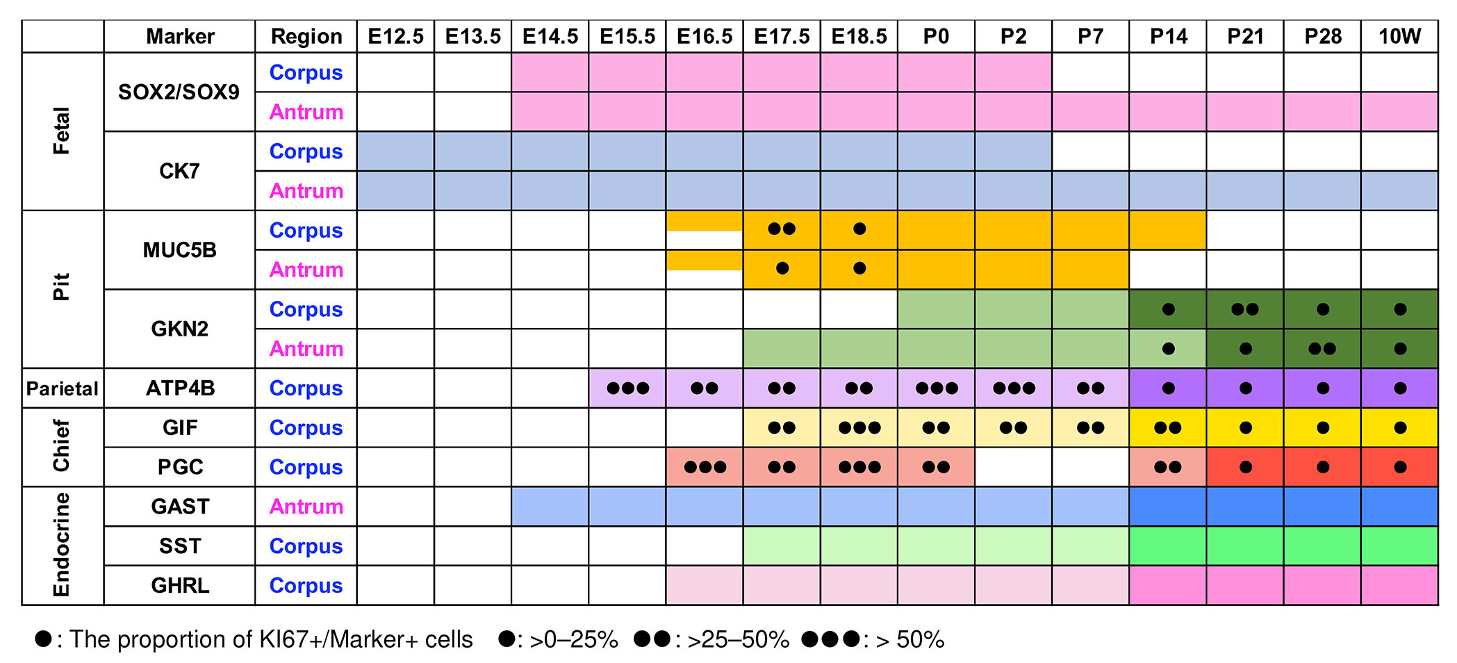 Fig. 6. Spatiotemporal expression of ATP4B, GKN2, and KI67 in the corpus.